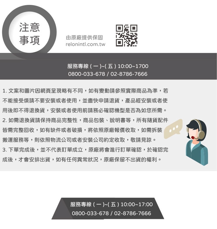 5.商品配置以文案頁面顯示或者實際機器狀況為主,如消費者有特殊需求,請於下單前來電諮詢原廠客服報價(02)8786-7666;如無事先提出需求,則以師傅當場報價為主。