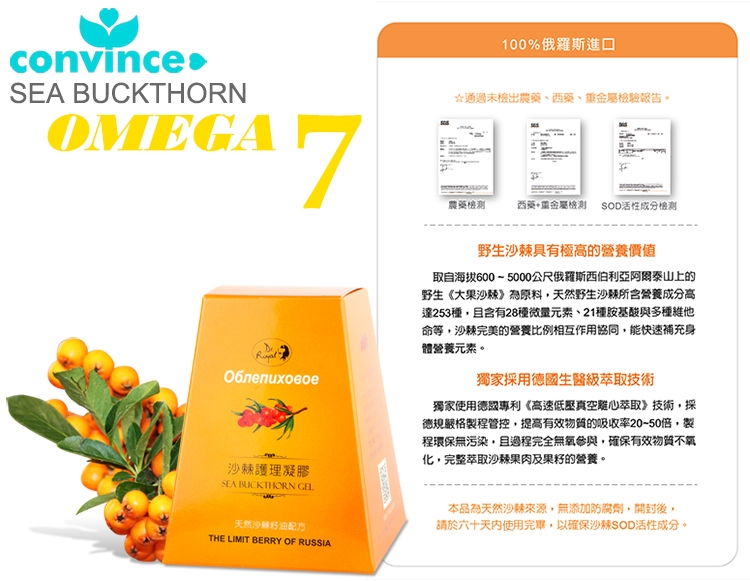 沙棘(又名極限果),生長在俄羅斯的深山區域,此區有著極大的溫差變化,因而富含多元不飽和脂肪酸及豐富的SOD、磷脂、維生素A、C、E、P、β胡蘿蔔素等百種珍貴成份,能提供皮膚全方位的補給,征服您挑剔的皮膚,溫和不刺激,提昇肌膚對環境傷害的保護力,調理肌膚維持健康,守護全家人皮膚必備的修護精華。