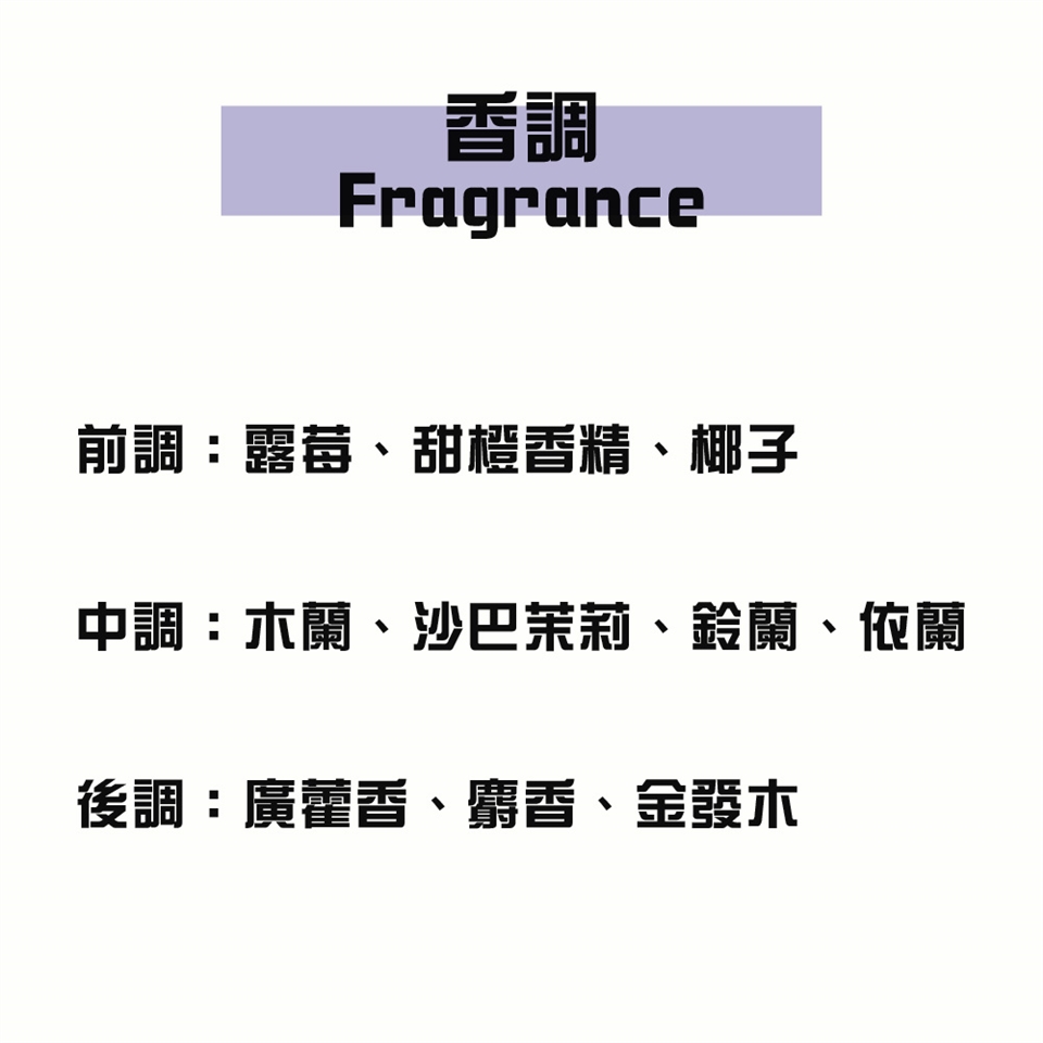 前調:露莓香調、甜橙香精、椰子香調