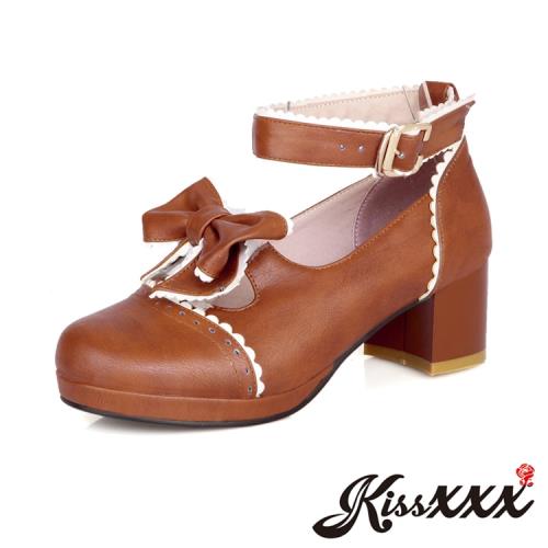 【Kissxxx】撞色花邊蝴蝶結高跟鞋/甜美小圓頭撞色花邊縷空蝴蝶結拼接造型高跟鞋 女鞋 棕