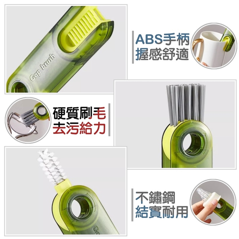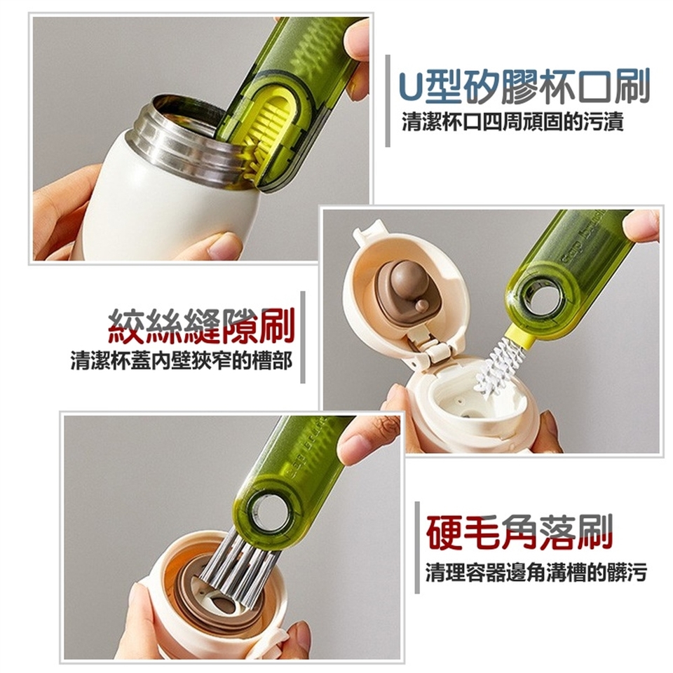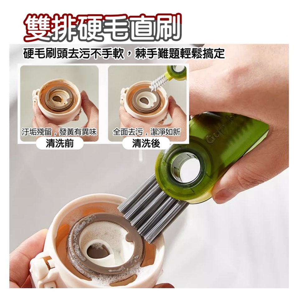 深入縫隙清潔,輕鬆去污,U型矽膠杯口刷,清潔頑固的污漬,硬毛刷頭,清理容器邊角溝槽的髒汙,鐵絲縫隙刷,清潔杯蓋內壁,三合一刷頭、軟硬兼備,單向旋轉,清潔無死角,自帶掛孔,方便懸掛瀝乾