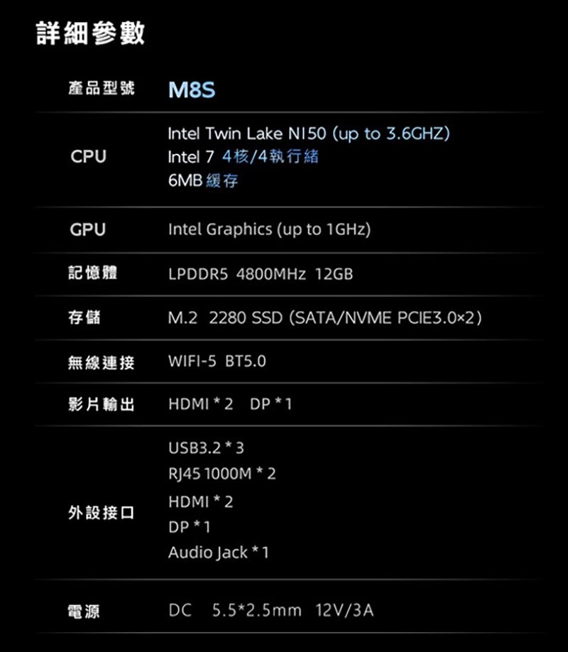 .內容物:M8S (升級版)迷你電腦(Intel N150 3.6GHz)*1、專用電源變壓器(100~240V)*1、HDMI線*1