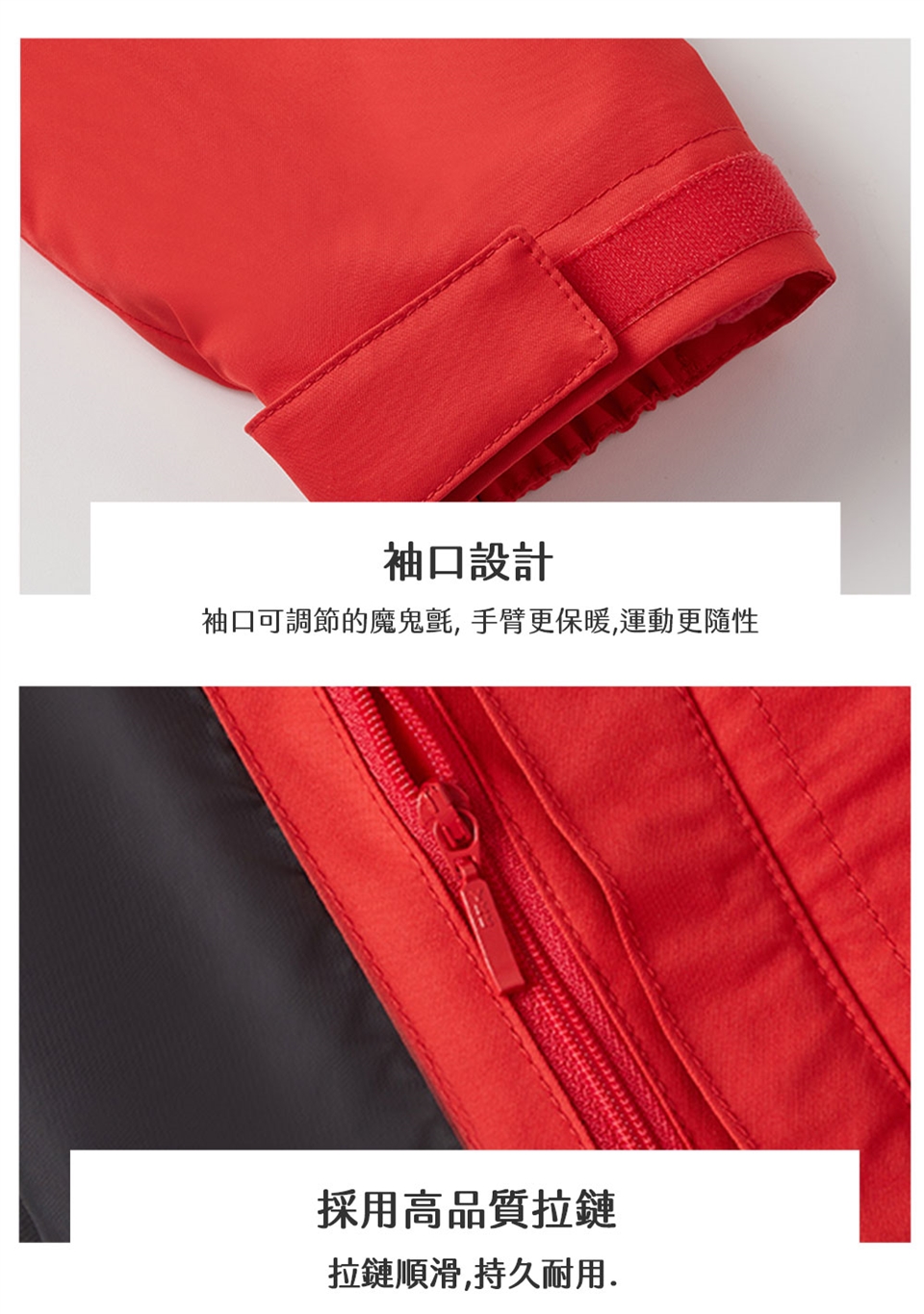 - 袖口處可調節的魔術貼,手臂更保暖,運動更隨性。