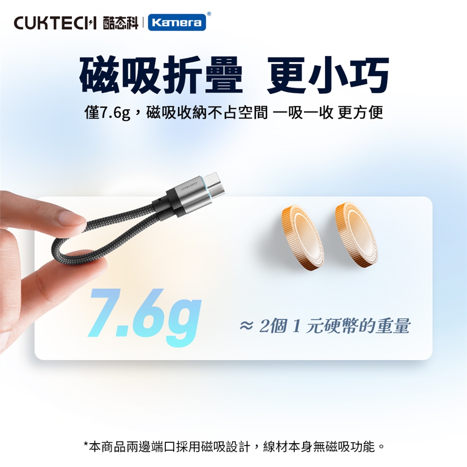 Type-C 接頭具備磁吸功能,可吸附在金屬表面或搭配磁吸配件使用。