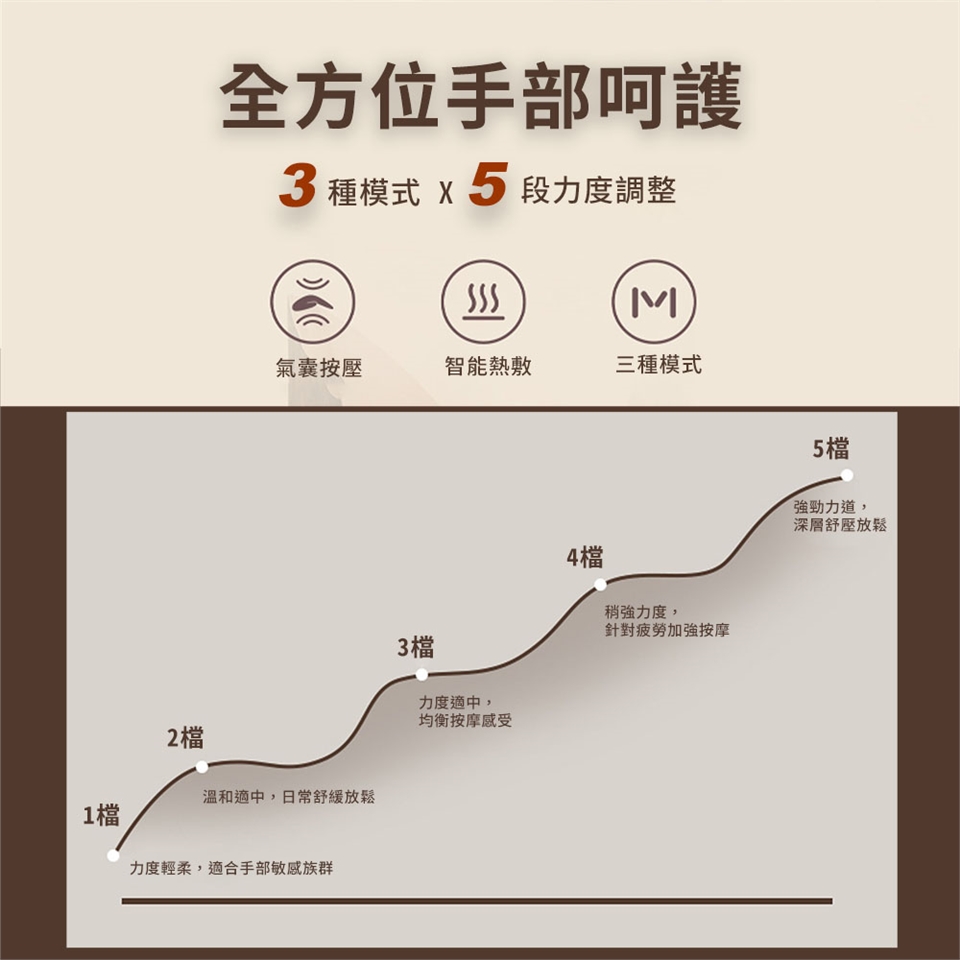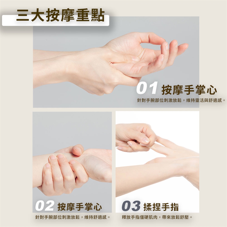 從輕柔舒緩到深層按壓,全面滿足不同需求。無論是長時間使用電腦、滑手機造成的手指僵硬,還是工作勞累導致的手腕緊繃,都能找到最合適的放鬆方案,真正做到全方位呵護雙手。