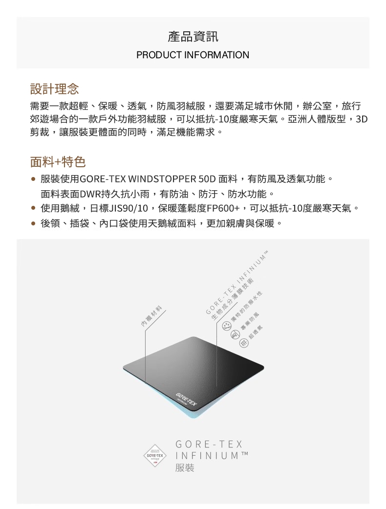 - 外層採用 GORE-TEX 防水透氣科技,無懼風雨,長效乾爽