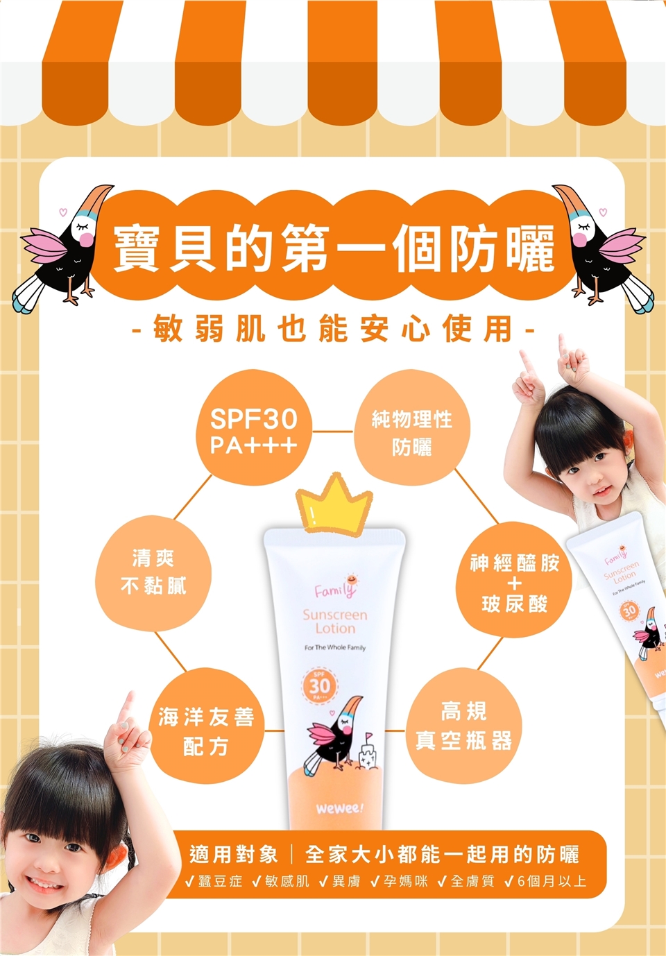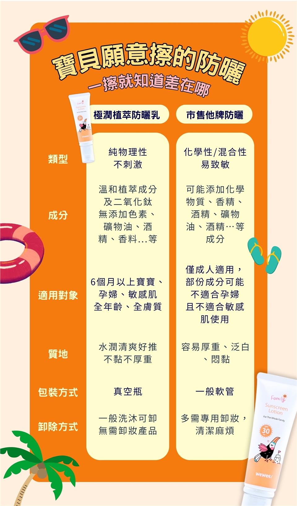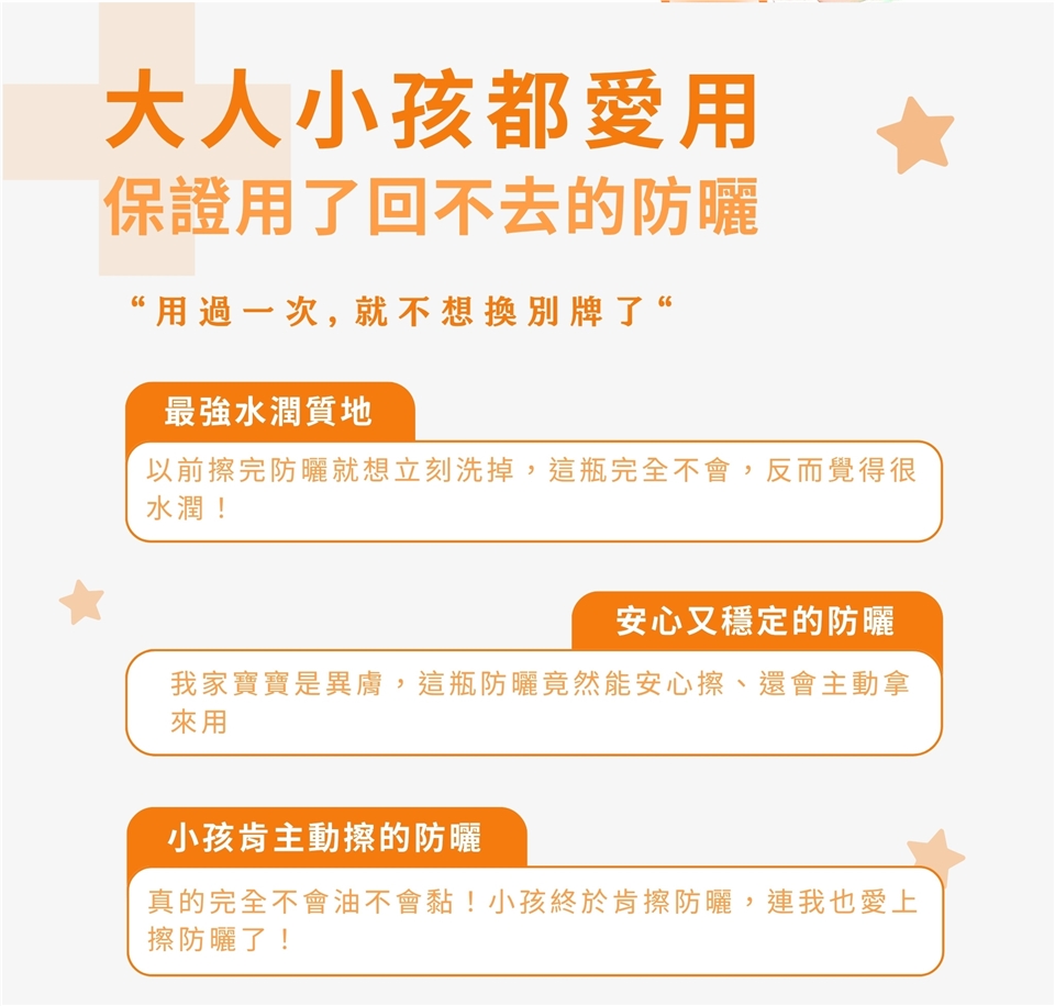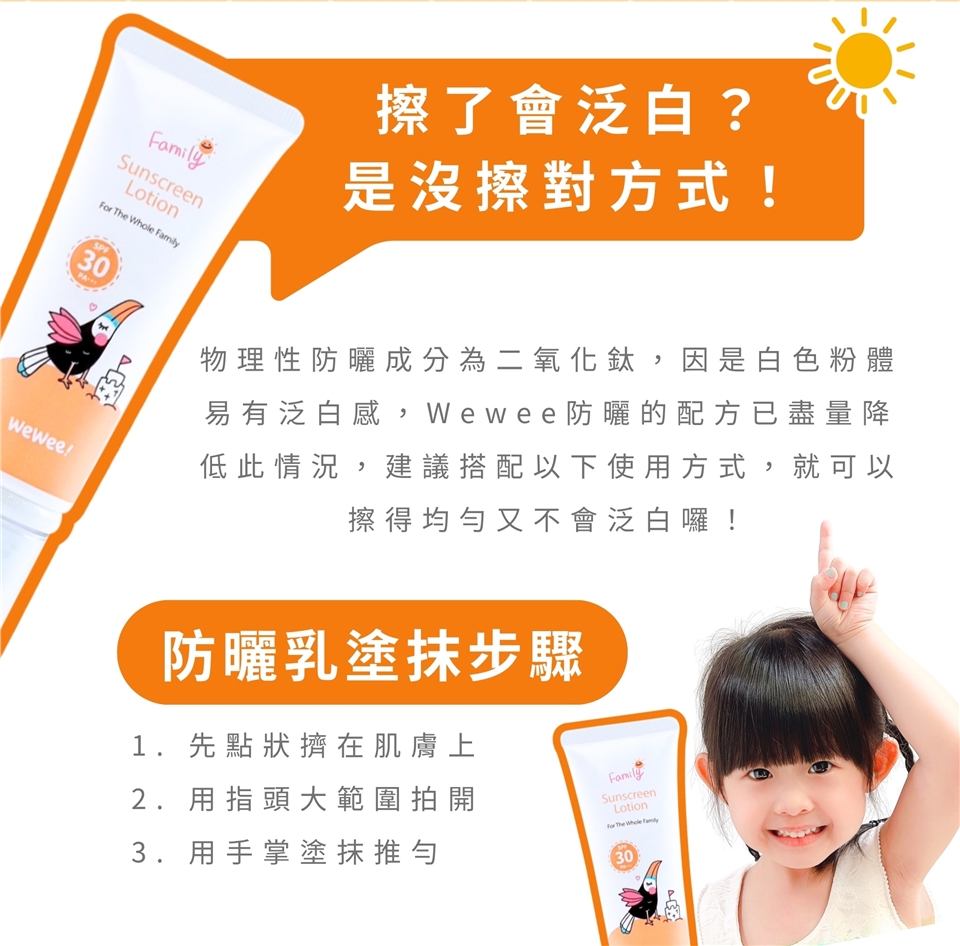 擠出適量防曬乳,均勻塗抹於肌膚(塗抹臉部請先在手心抹開再塗抹),擦拭的時候輕拍勻,再塗抹會更均勻。