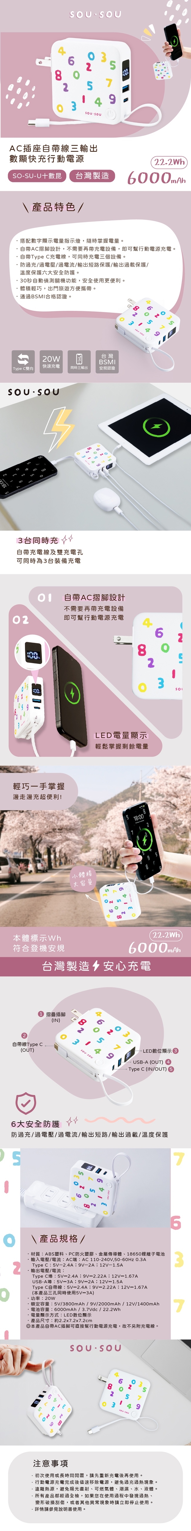 SOU.SOU十數昆【台灣製造】AC插座自帶線三輸出數顯快充行動電源  22.2Wh