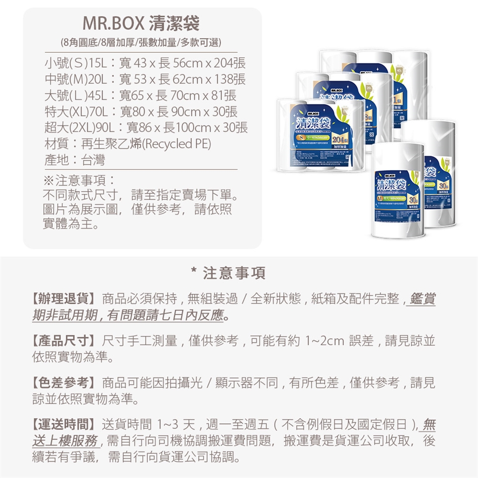 ✱1.請避免陽光直射,存放於乾燥陰涼處遠離火源。2.請勿將垃圾帶套於頭上,以免窒息。3.請將產品儲藏於孩童及寵物無法觸摸、攀爬取得或看見的安全位置。