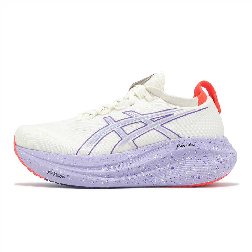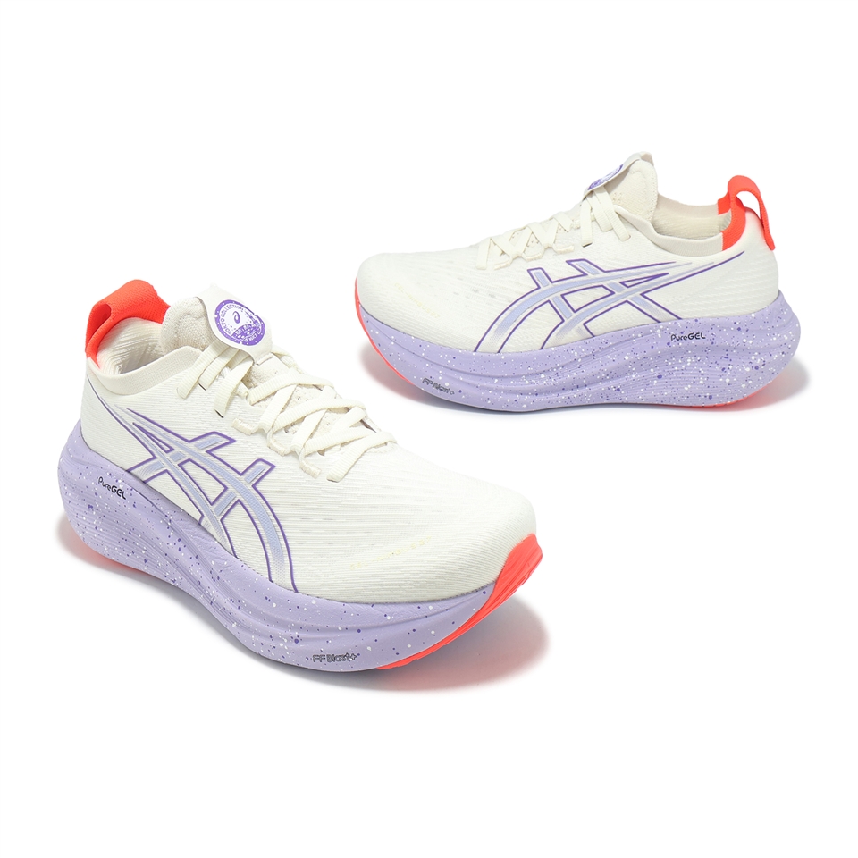 * GEL-NIMBUS 27 TOKYO 東京系列,鞋舌印有東京國立競技場的圖樣,整體採用紫色為基底,搭配代表活力及熱情的旭日紅,以及象徵歡慶紙花的圖樣結合而成。