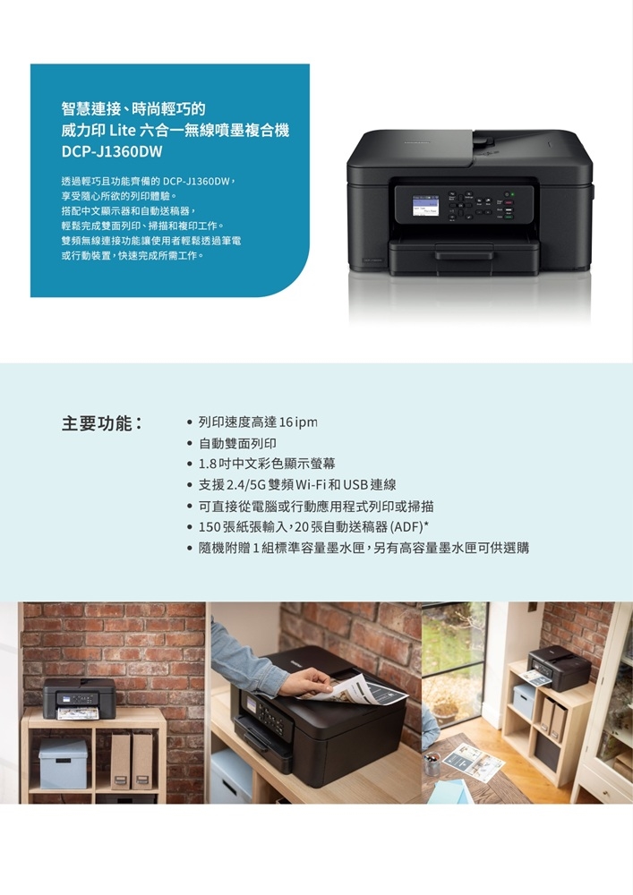 自動雙面列印、20 張自動送稿器(ADF)、1.8 吋中文彩色 LCD 螢幕