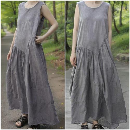 【米蘭精品】現貨+預購 新中式長洋裝棉麻上衣亞麻長裙A字裙連身裙子大碼休閒女裝-無袖精梳棉竹節紋74md8