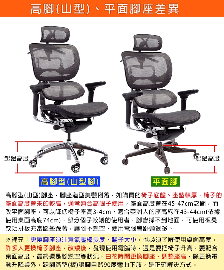 ※補充:更換腳座須注意氣壓棒長度、輪子大小,也必須了解使用桌面高度,許多人更換椅子腳座,改矮後,發現使用電腦時,還是要把椅子升高,要配合桌面高度,