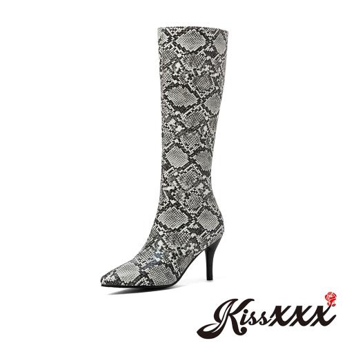 【Kissxxx】尖頭蟒蛇紋高跟長靴/尖頭美腿效果經典蟒蛇紋時尚高跟長靴 女鞋 黑