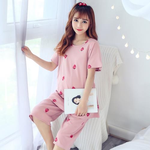 【lingling日系】全尺碼-草莓印圖棉質側掀哺乳孕婦短袖二件式睡衣組(草莓豆沙粉)A4379
