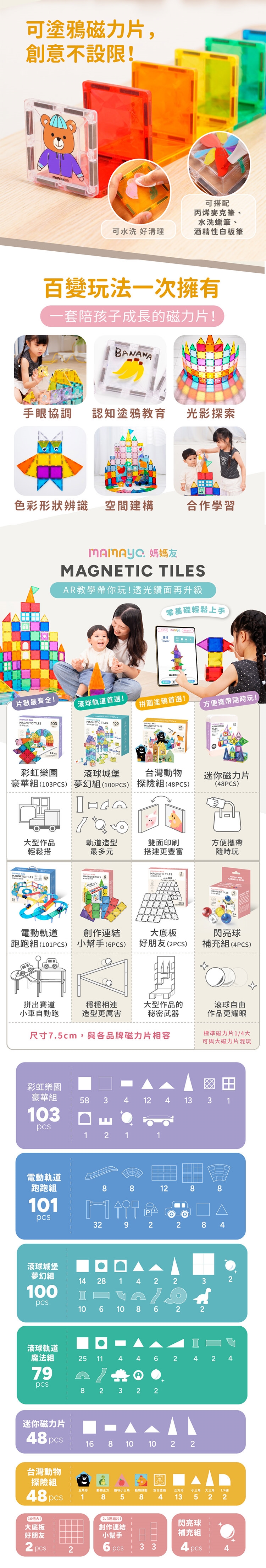 ▶ 可以。Mamayo 系列以一致磁力設計為基礎,大小件可互相吸附搭建,讓作品更有延展性與創作彈性。大磁力片邊長為7.5cm,小磁力片為3.75cm,小磁力片剛好是大磁力片邊長的一半。
