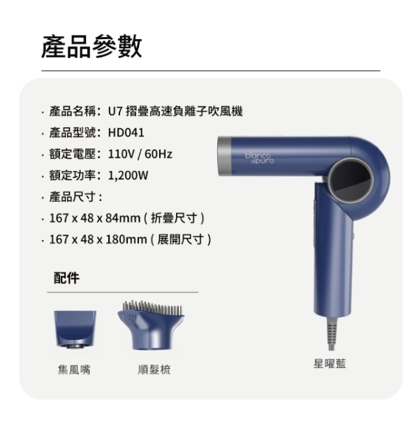 Bianco di puro 彼安特 U7 摺疊高速負離子護髮吹風機HD041