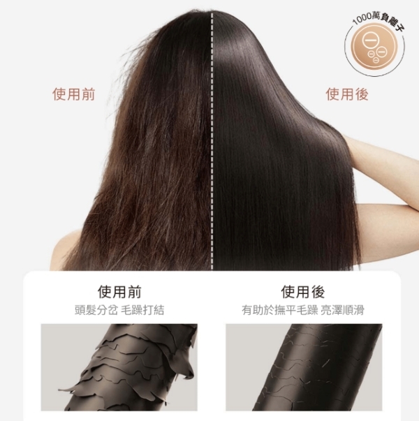 1,000 萬負離子水潤輸出,降低毛躁,呵護頭髮