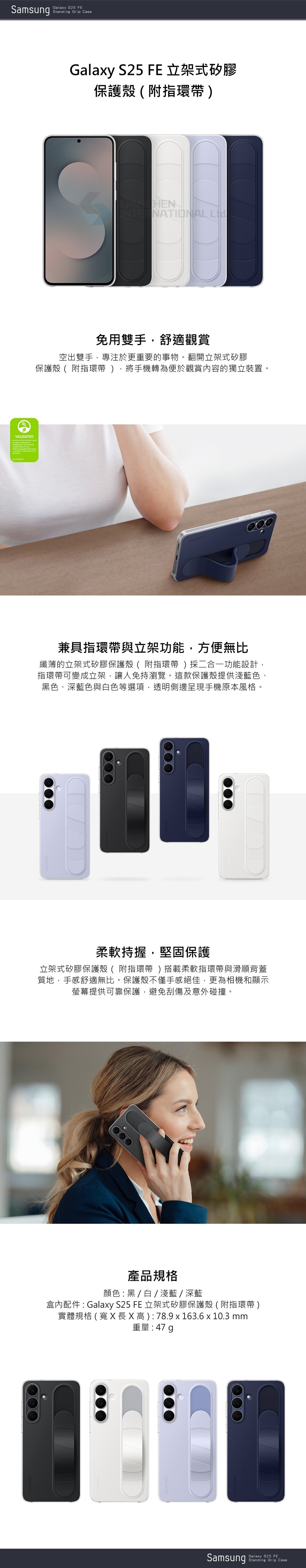 內容物:Galaxy S25 FE 立架式矽膠保護殼 ( 附指環帶 ) *1
