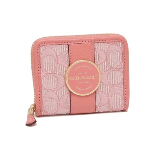 【COACH】織布拼接牛皮皮革ㄇ型拉鍊短夾-太妃粉