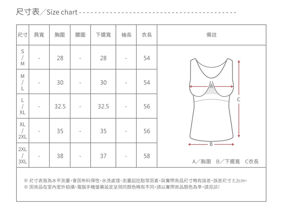 ※本尺寸表會因布料彈性、水洗處理、量測起訖點、人為拉扯等因素,與實際商品略有誤差。