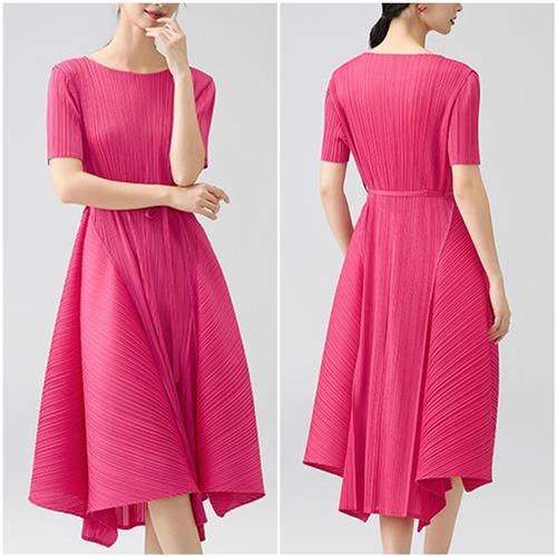【米蘭精品】現貨+預購三宅風皺褶衣服洋裝褶皺長裙短袖連身裙子摺衣彈力女裝折衣大碼-系帶收腰6色74mm29