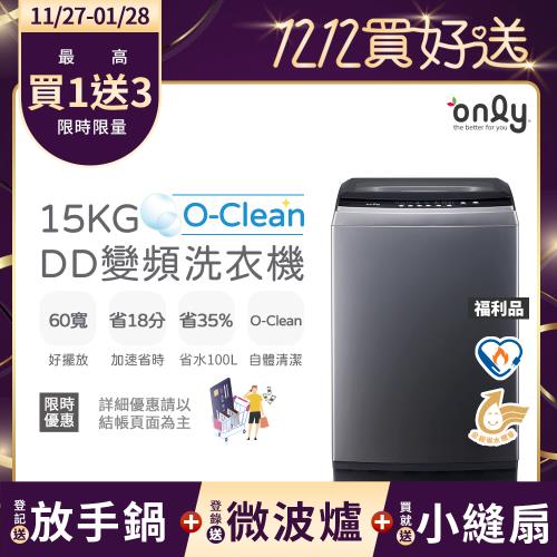 【 TOP熱銷~搶先預購!】贈DC變頻小縫扇~only O-Clean 15KG窄身好取DD變頻洗衣機 灰 福利品(省水15公斤直立式)