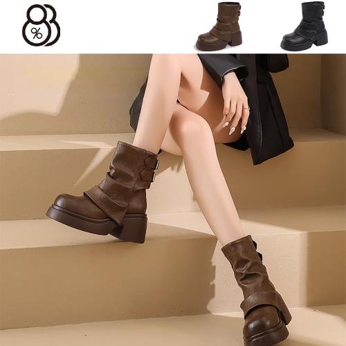 【88%】前3後6.5cm筒高17筒圍30cm 美拉德復古堆堆短靴厚底抓摺馬丁靴粗跟靴 2色