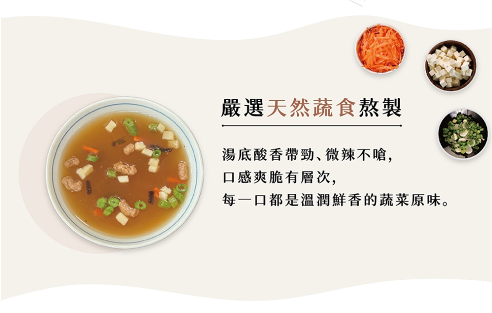 成份:糊精纖維、白醋粉(純驤造米醋、麥芽糊精、檸檬酸、無水醋酸鈉)、烏醋粉(純醸造烏醋、麥芽糊精、樹薯澱粉、砂糖、蘋果酸、琥珀酸二鈉、焦糖色素、I+G、黑胡椒椒粉)、馬鈴薯澱粉、醬油粉醬油、麥芽糊精、鹽)、素肉絲(素肉絲(大豆蛋白、澱粉、小麥蛋白)、醬油、砂糖、鹽)、鹽、紅蘿茴絲(紅蘿茴、葡萄糖)、豆腐(非基因改造)、關華豆膠、結晶葡萄糖、木耳絲(木耳、麥芽糊精、鹽)、乾燥敏豆(敏豆、葡萄糖、鹽)、棕櫚油粉(麥芽糊精、棕櫚油)、酵母抽出物、白胡椒粉、黑胡椒粒、麻油粉(麥芽糊精、黑麻油)、辣椒粉