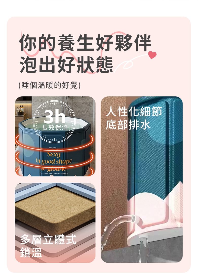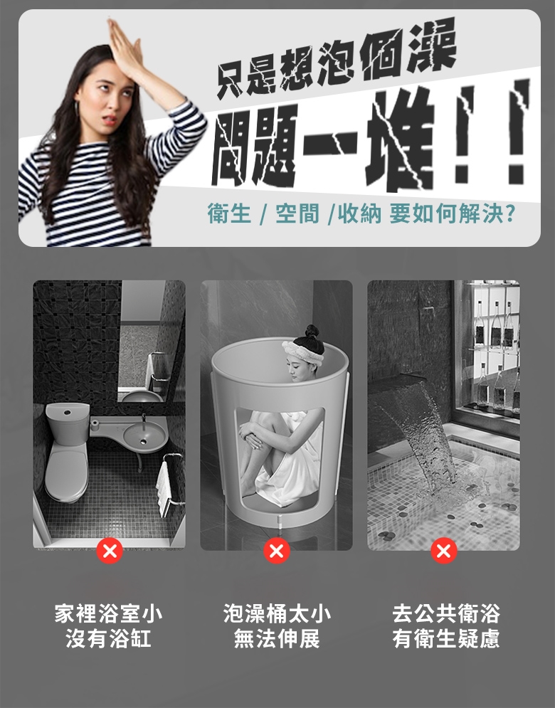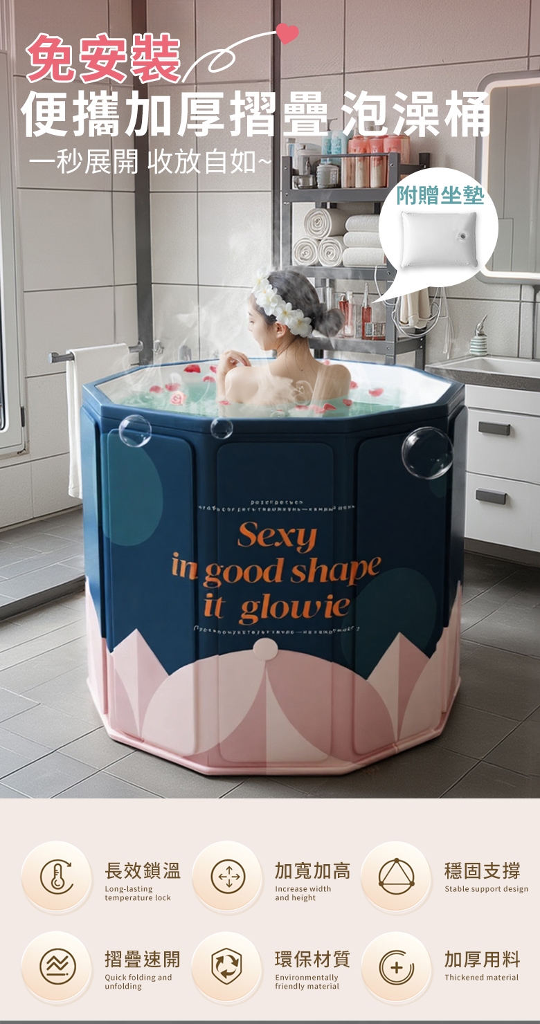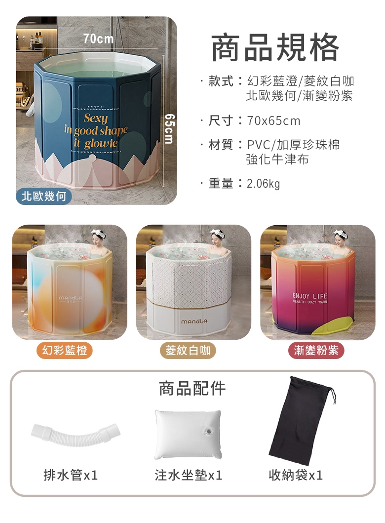 內容物:注水坐墊x1/彈力排水管x1/收納袋x1/摺疊澡桶主體x1