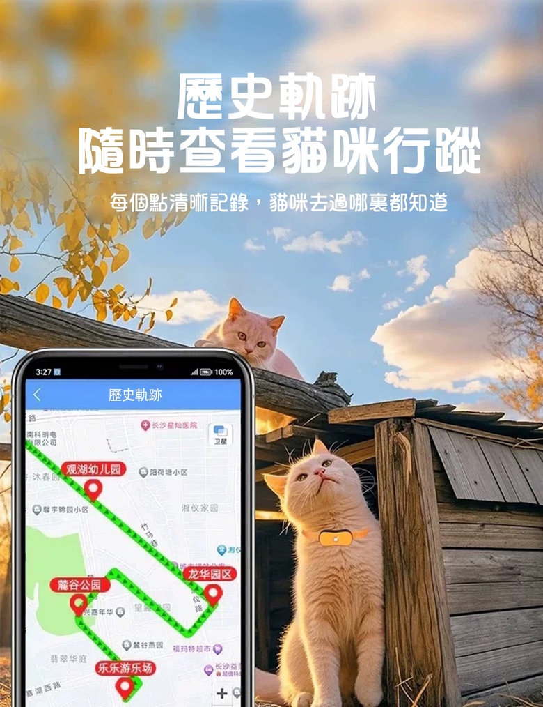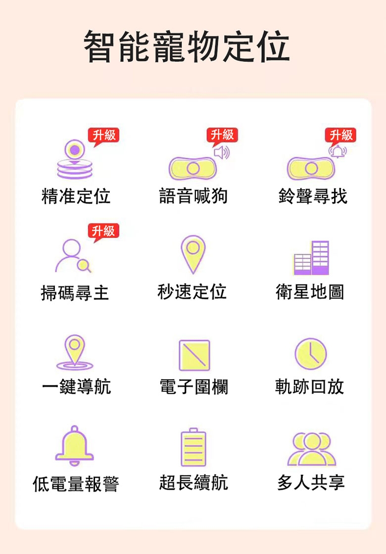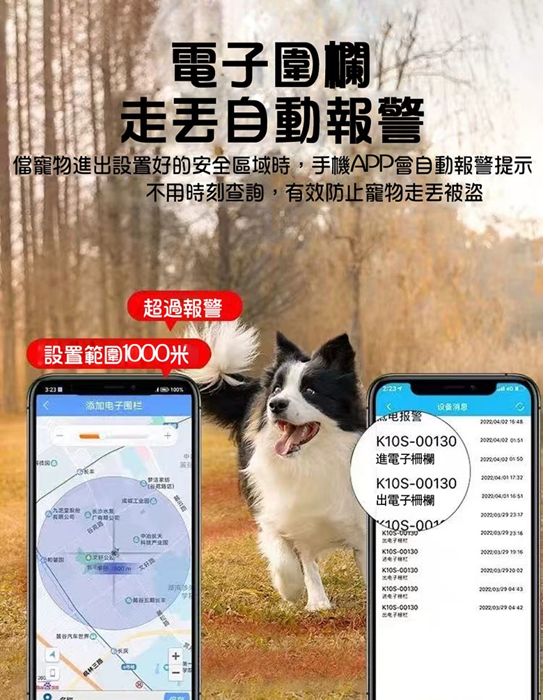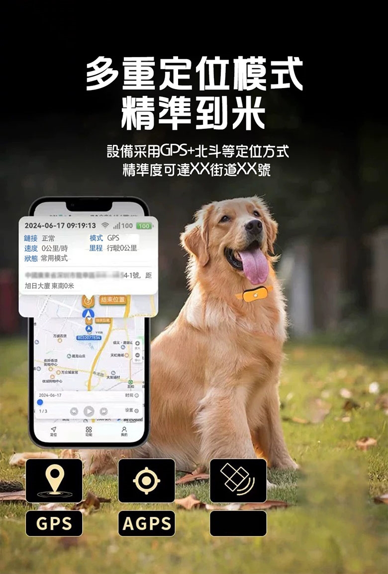 - 功能:實時精準定位、電子圍欄、歷史軌跡、低電報警、一鍵導航、響鈴尋找、遠程喚狗等