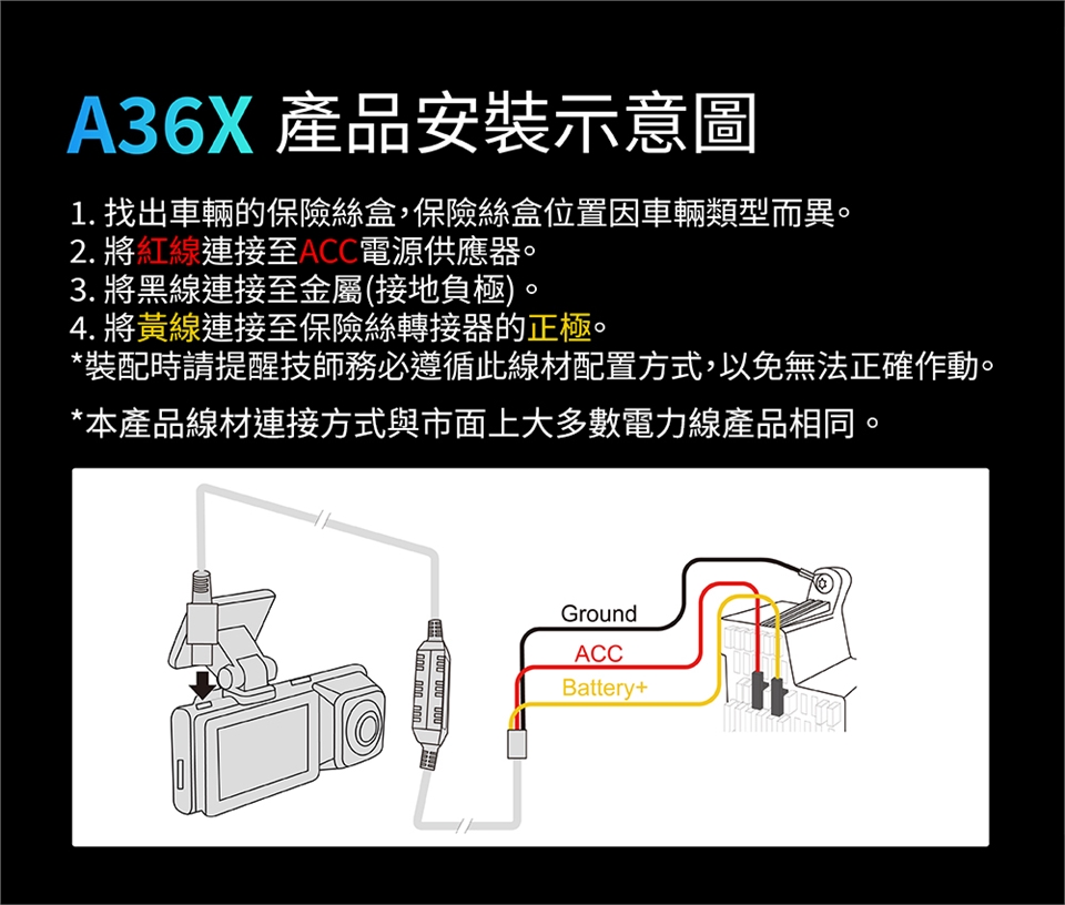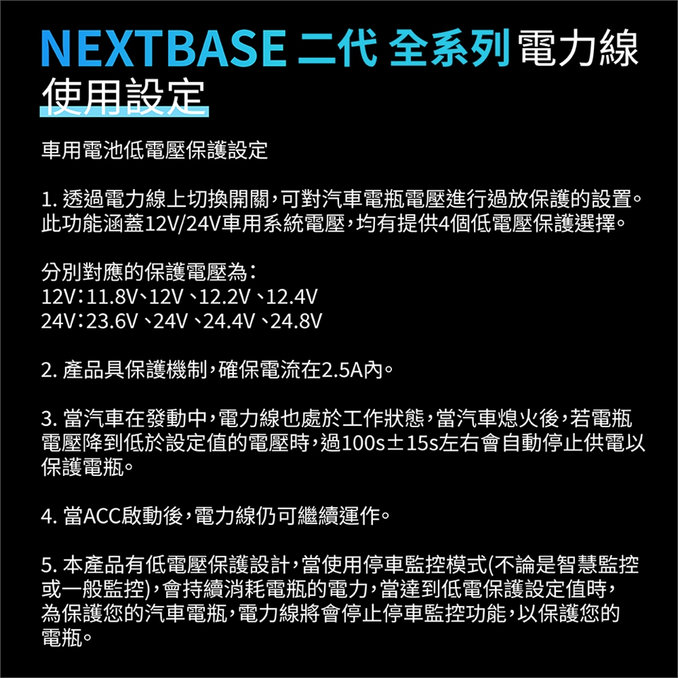 * 用於停車熄火後的停車監控模式,具有低電壓保護設計,可防止過度放電
