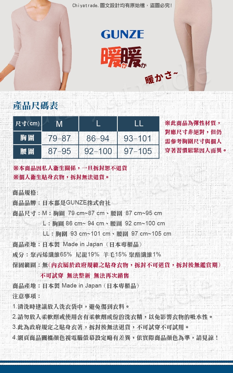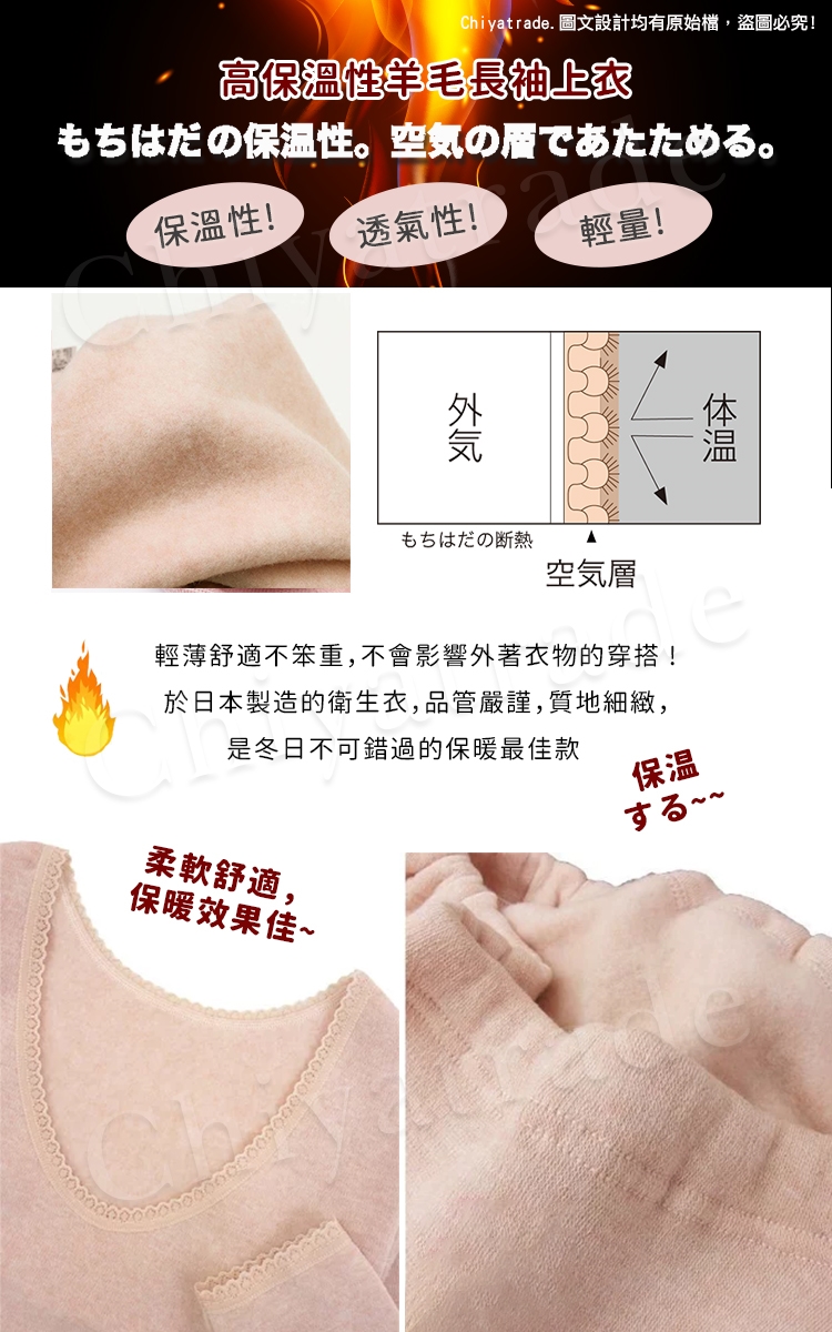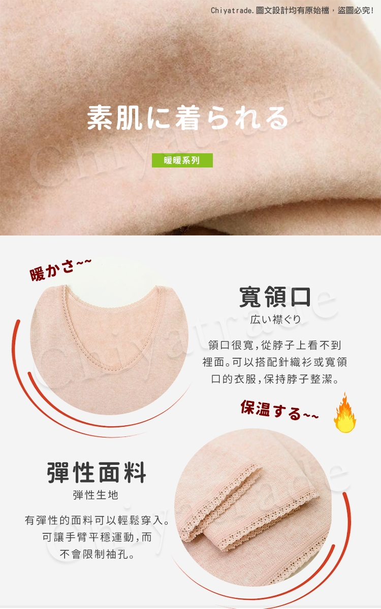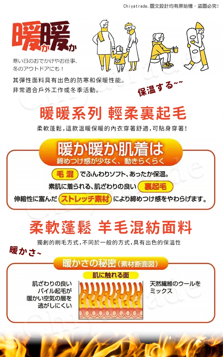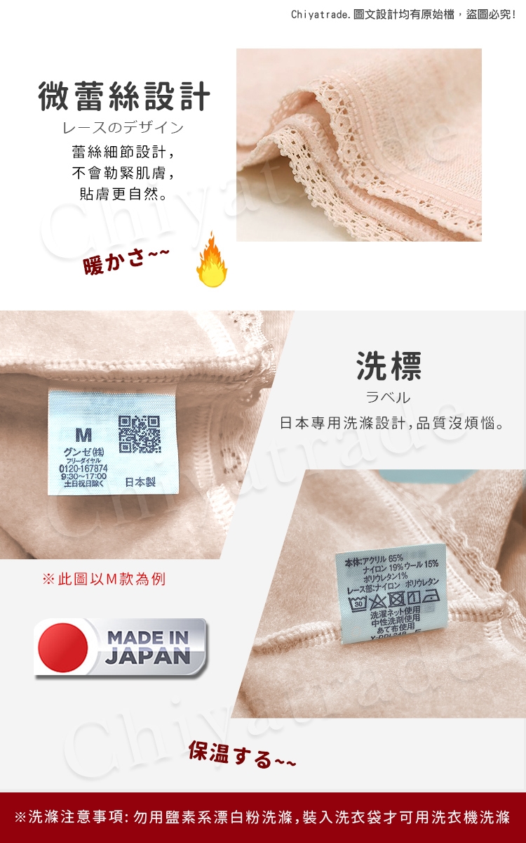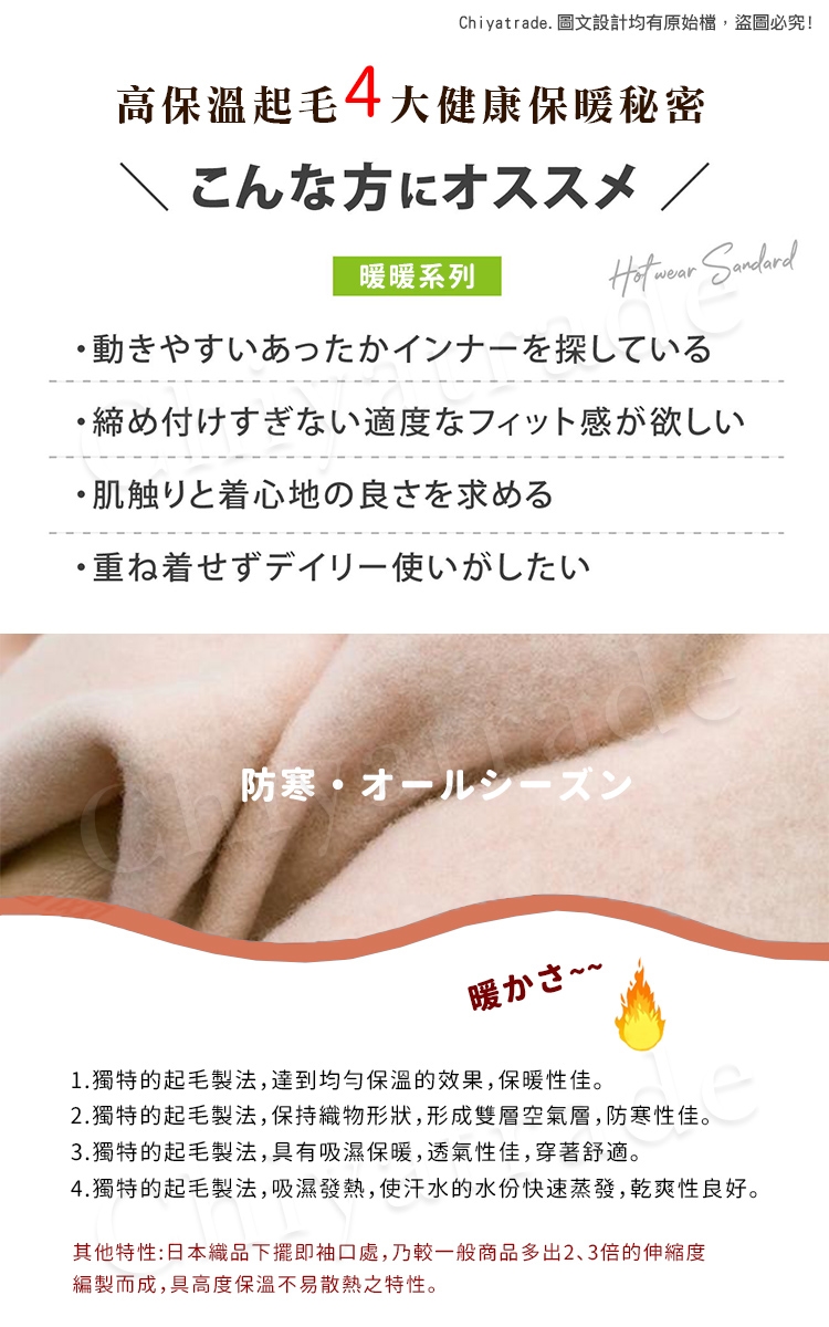 其他特性:日本織品下擺即袖口處,乃較一般商品多出2~3倍的伸縮度編製而成,具高度保溫不易散熱之特性。