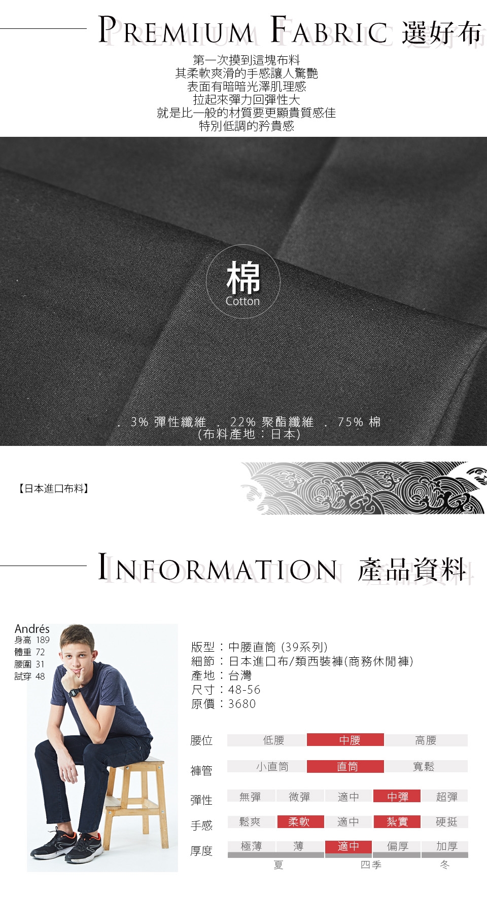 我們的堅持在於使用好的材質、簡單設計,不斷的開發順應時代潮流 開創出屬於成熟男性的自我風格,每一季穩定設計多樣化的褲款