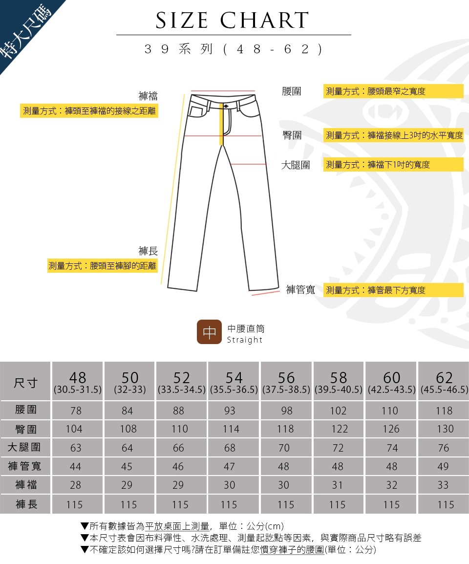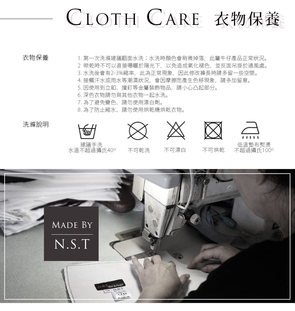 E.水洗後會有2-3%縮率,此為正 常現象,在修改褲長時請稍微增長褲長;此外,為了防止縮水,請勿使用烘乾機烘乾衣物。