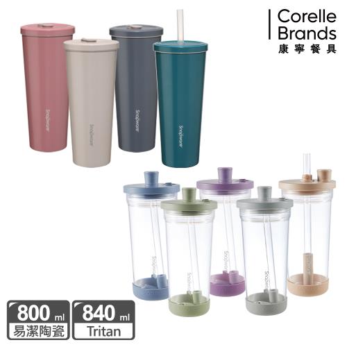 (1+1)【美國康寧】Snapware 陶瓷不鏽鋼真空保溫吸管杯800ml (贈吸管組*1+杯袋*1)+Tritan跳跳透明吸管杯840ML