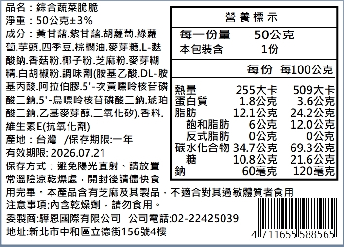 贈品:綜合蔬菜脆脆 (50公克士3%/包)*1包(開放體驗)