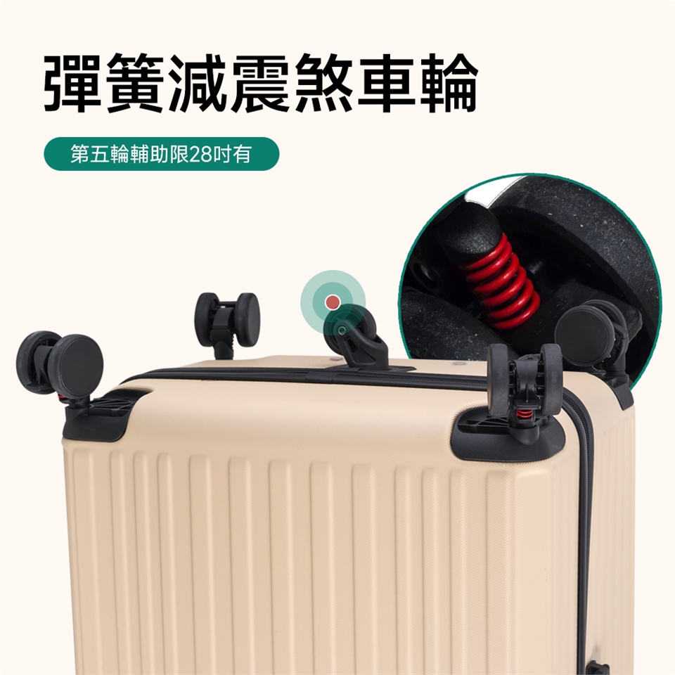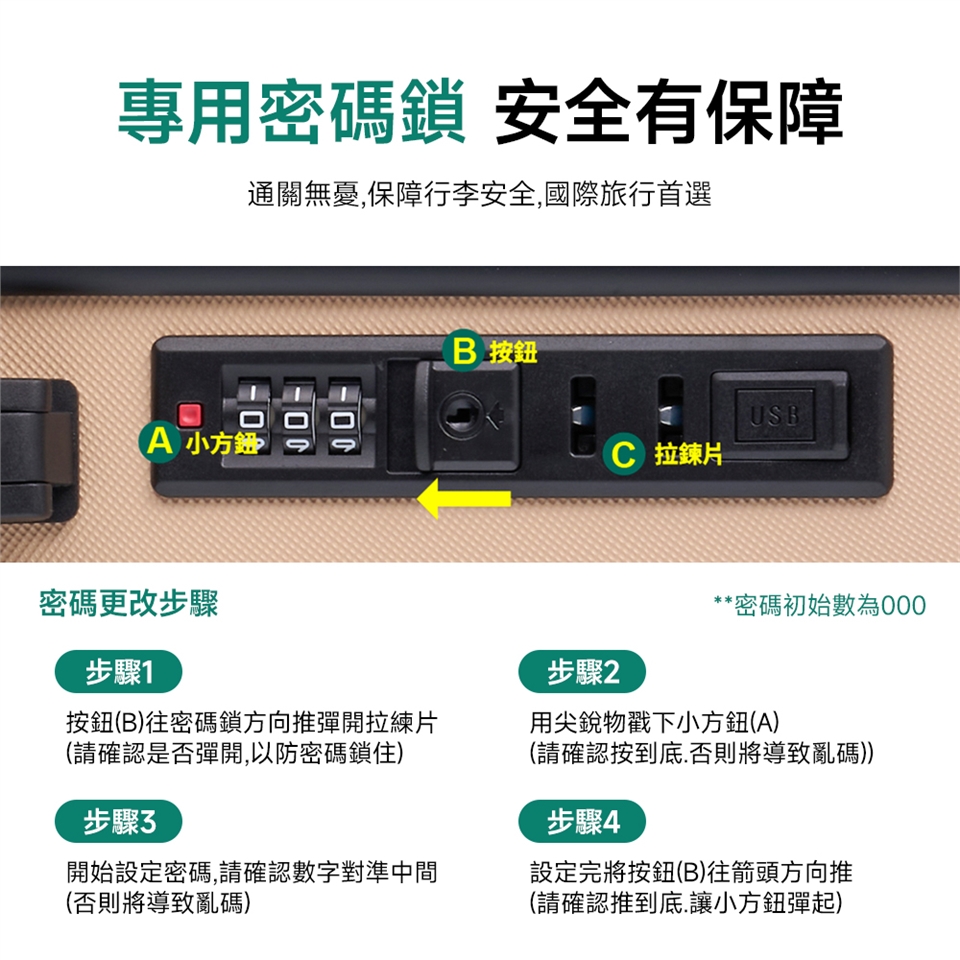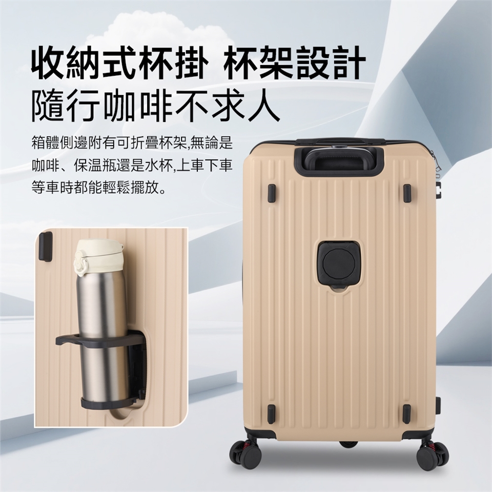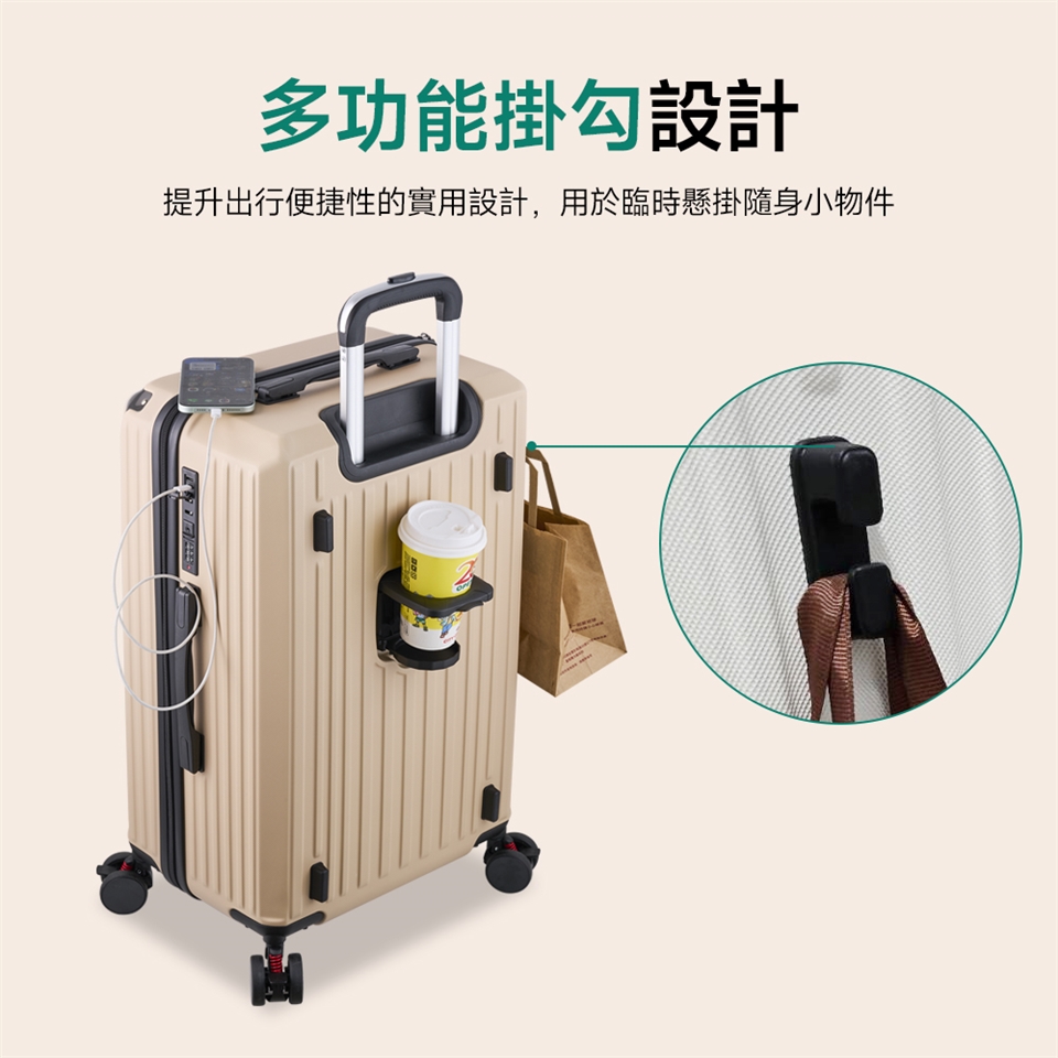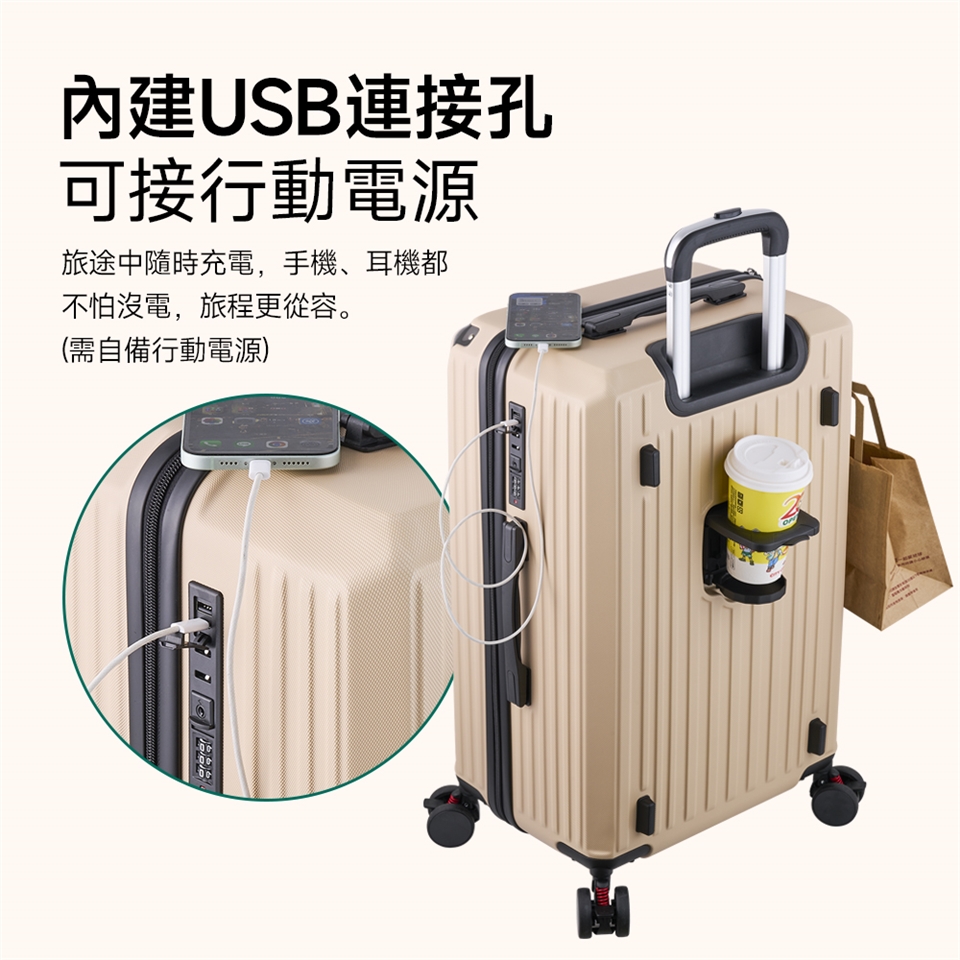 配備:彈簧減震輕音煞車輪+杯架+USB充電+雙側掛勾+內嵌式密碼鎖( 非海關鎖USB充電需自行使用行動電源)