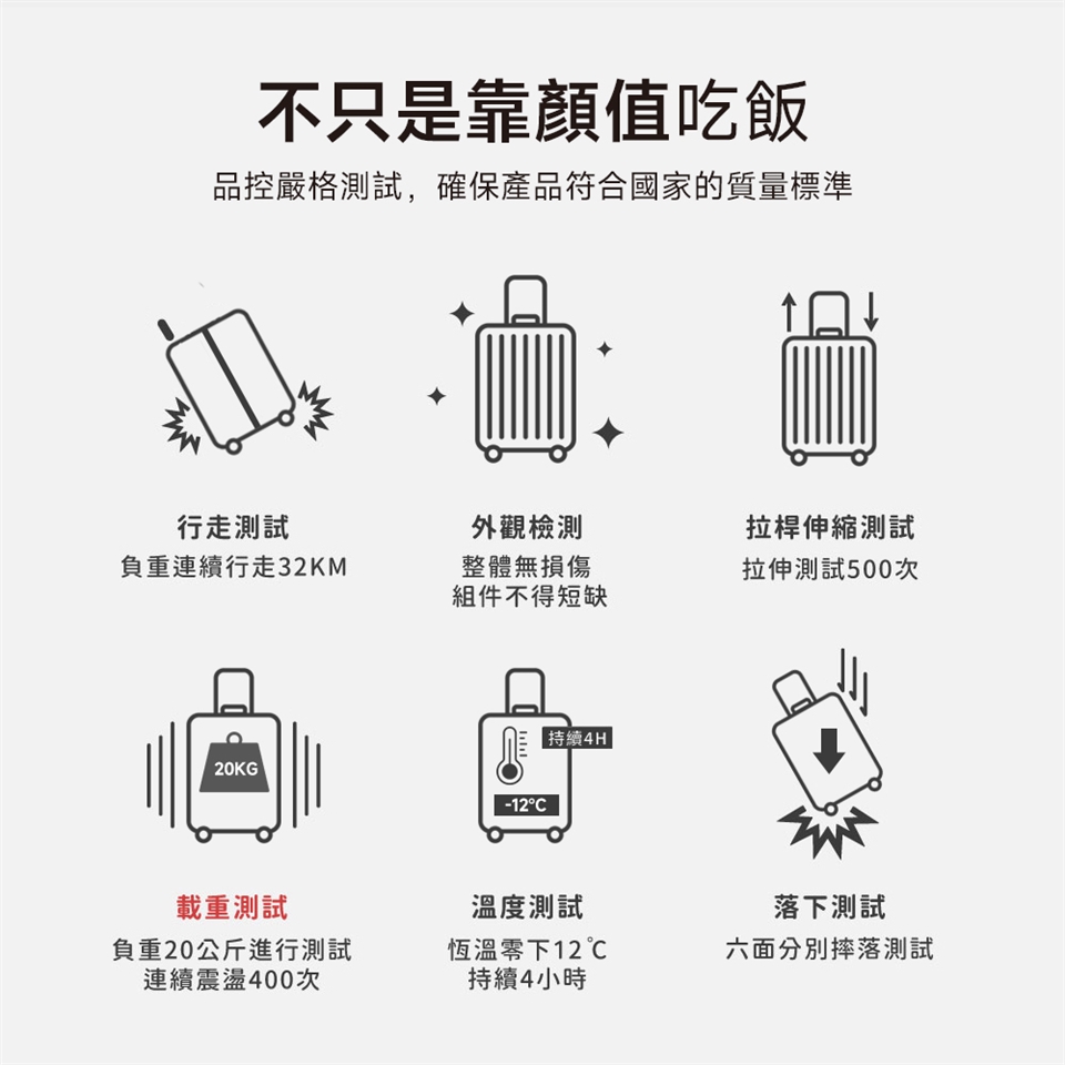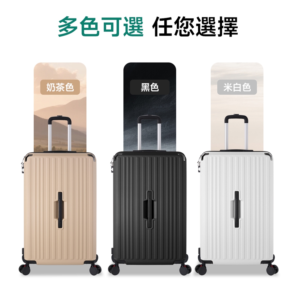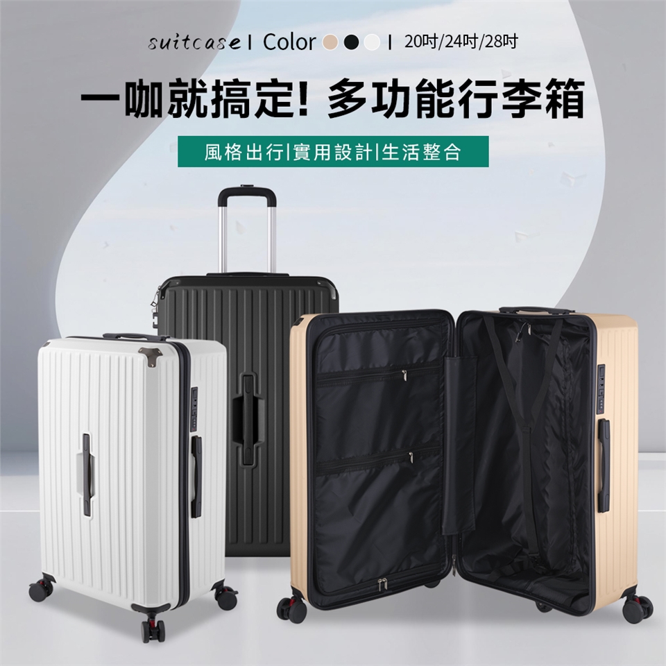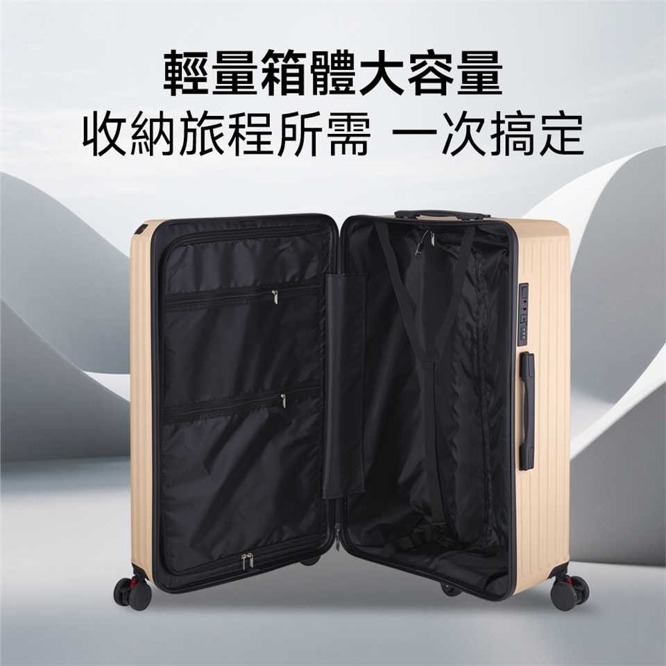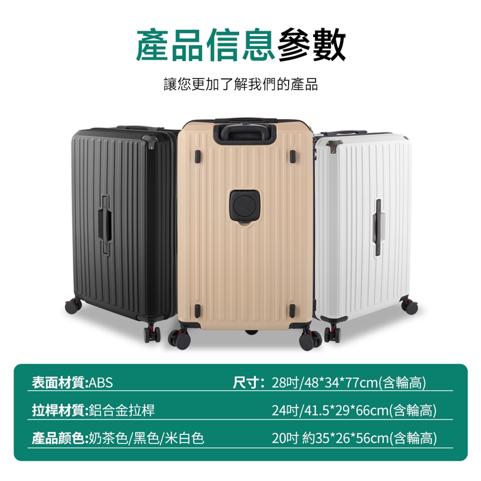 配備:彈簧減震輕音煞車輪+杯架+USB充電+雙側掛勾+內嵌式密碼鎖( 非海關鎖USB充電需自行使用行動電源)