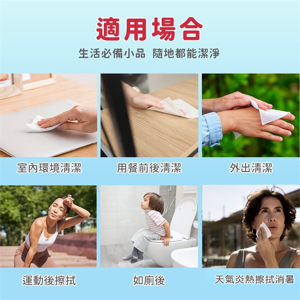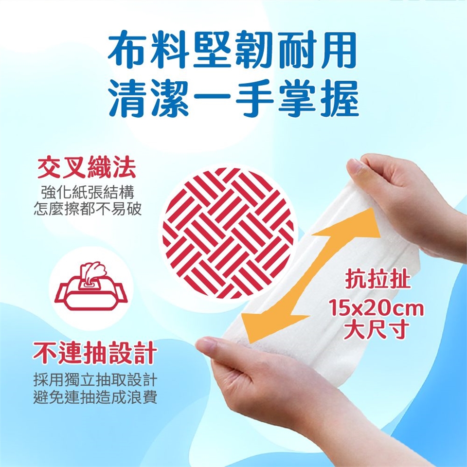 將包裝正面封口貼紙向上撕開,即可抽出濕巾;使用後將封口蓋回原位,以防止水分蒸發