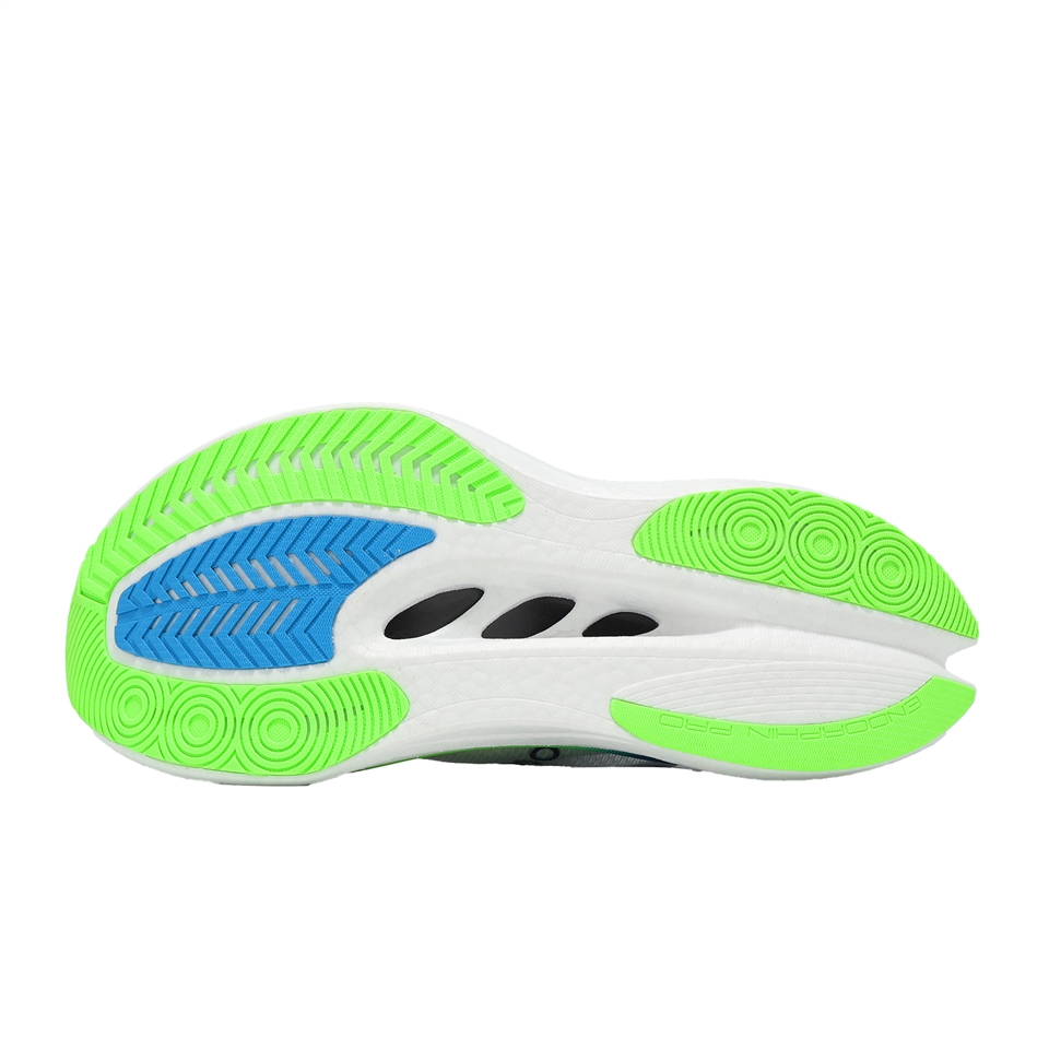 * 添加全掌 3D 碳纖維加強板,由鏟型設計改為帶有切槽的樣式,輕盈強韌的碳纖維板在提腳瞬間透過回彈反饋後,轉換成向前推進力,有助跑者突破個人PB。