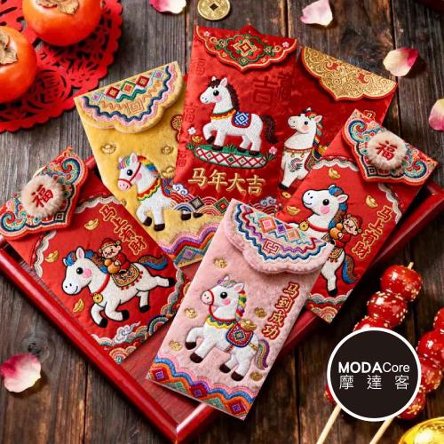 摩達客◉春節開運招財◉馬年QQ萌開運招財仿毛絨刺繡小馬紅包袋_6款圖案共12入組