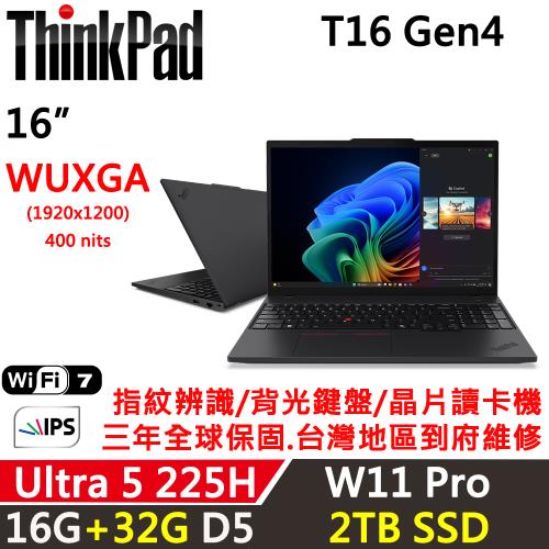 (規格升級)Lenovo聯想 ThinkPad T16 Gen4 16吋 AI PC Ultra5 225H/16G+32G/2TB/W11P/三年保