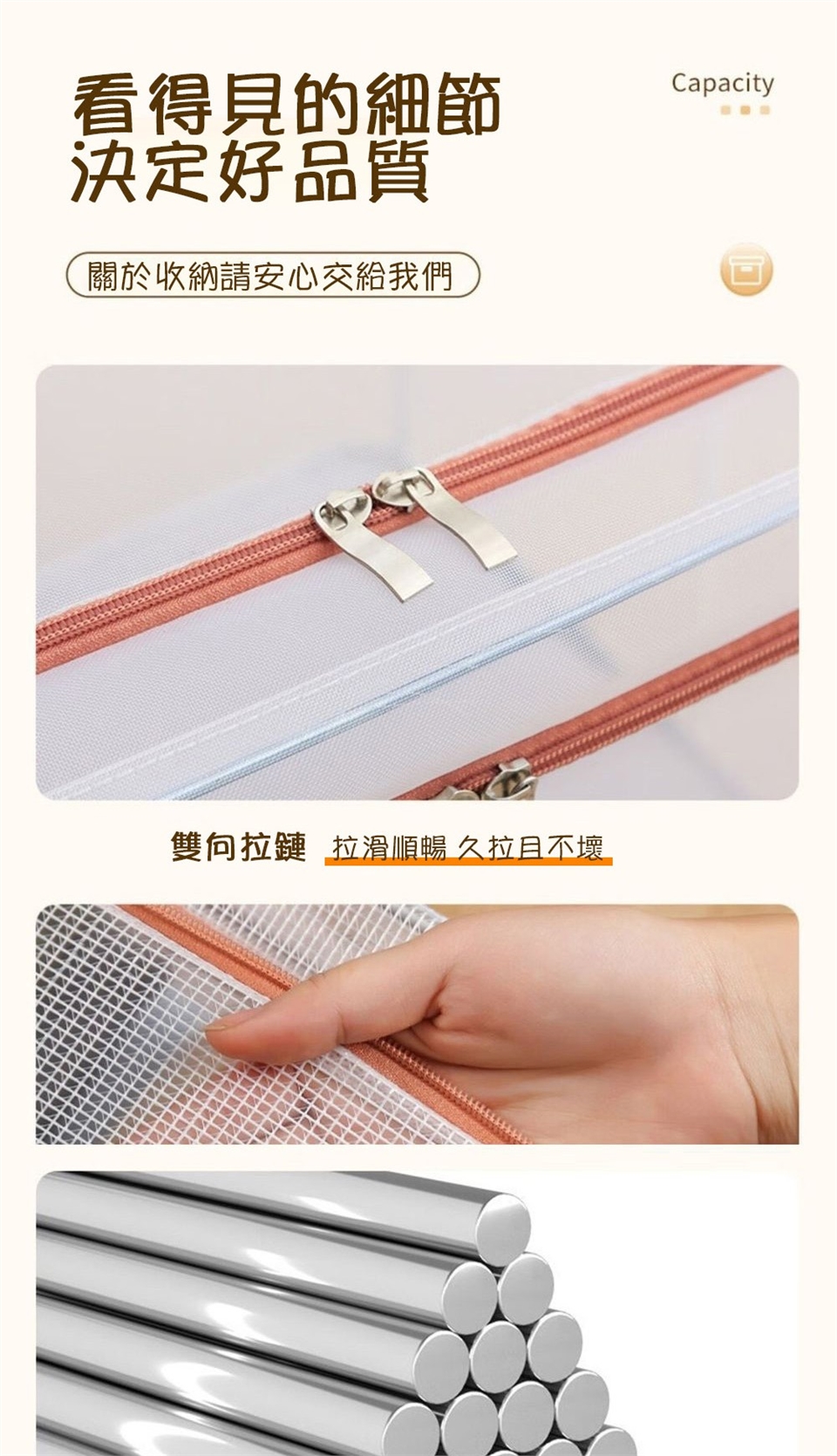 結構設計:加厚鋼架支撐、雙向拉鍊