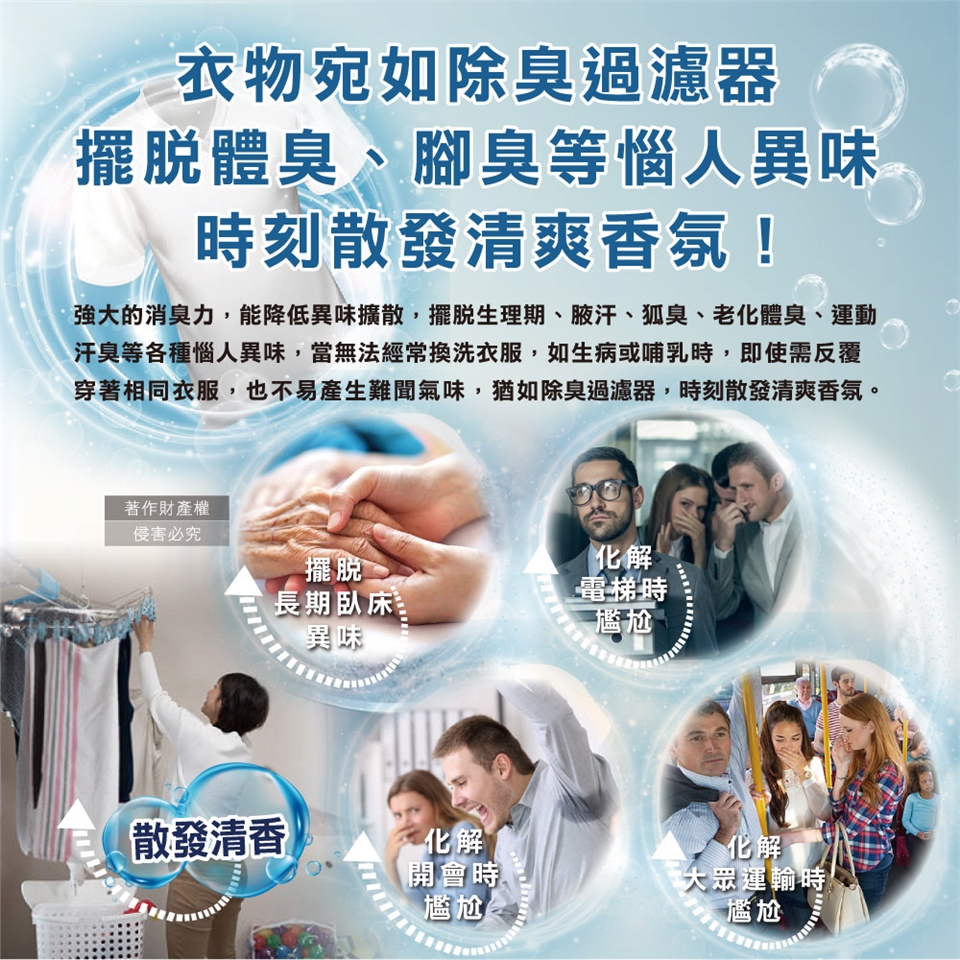 ●用途:用於衣物消臭,綿、毛、絹、合成纖維適用。