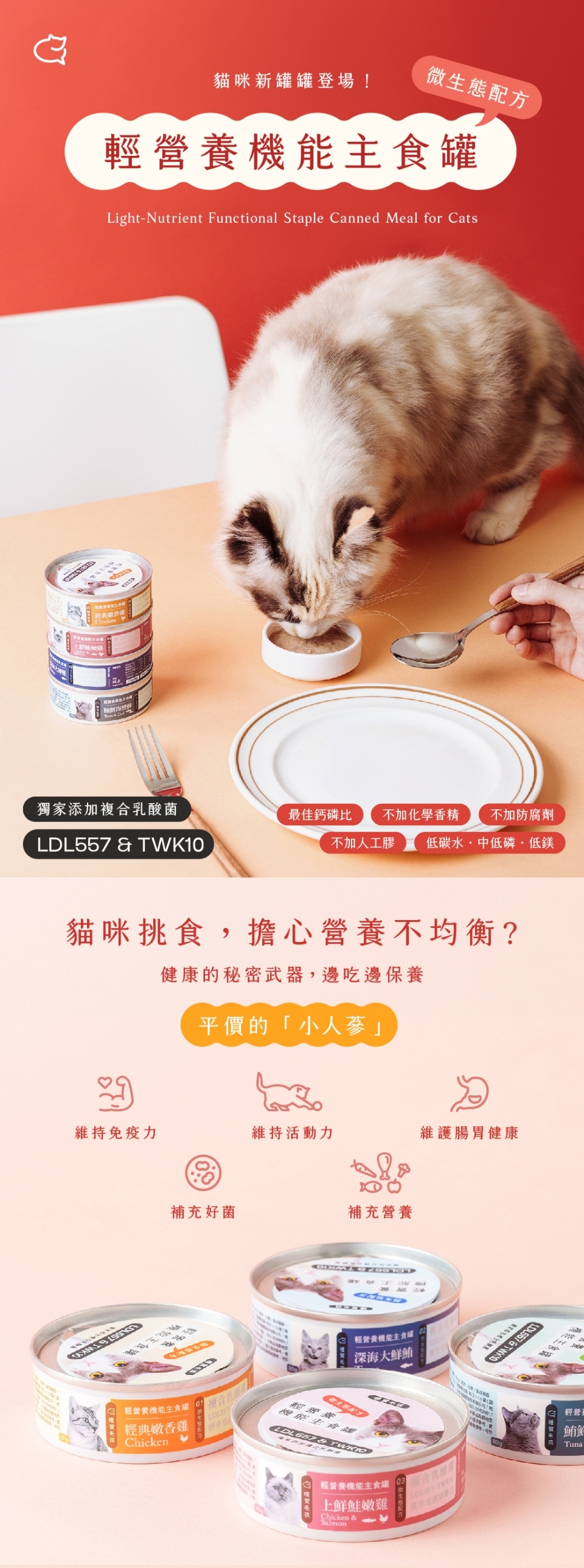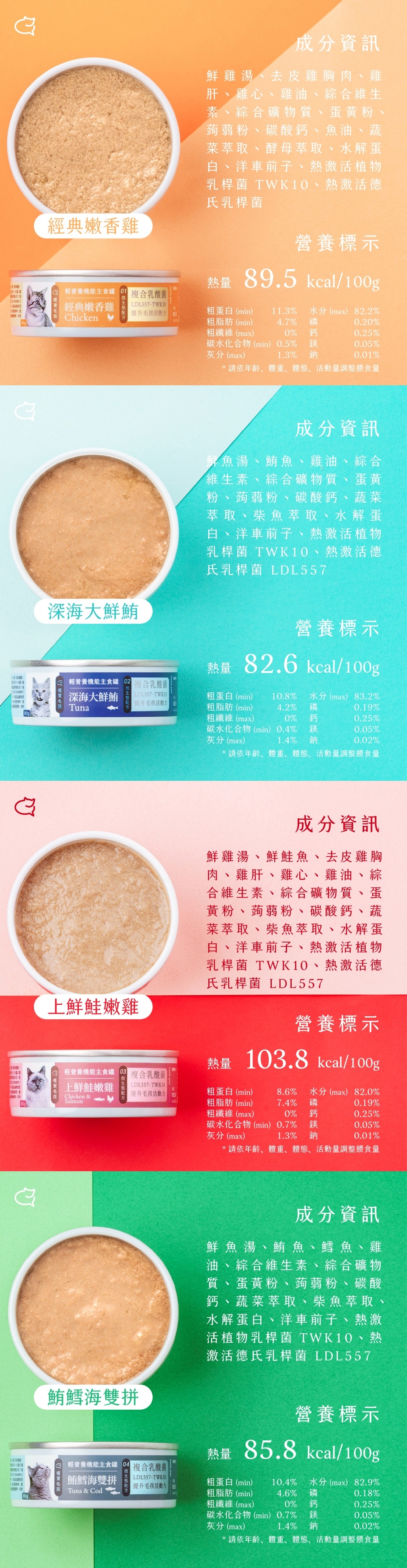 ◎循序漸進換糧: 如果是從乾飼料轉罐頭,請用七天換糧法,逐量增加罐頭比例,避免貓咪腸胃不適或挑食。