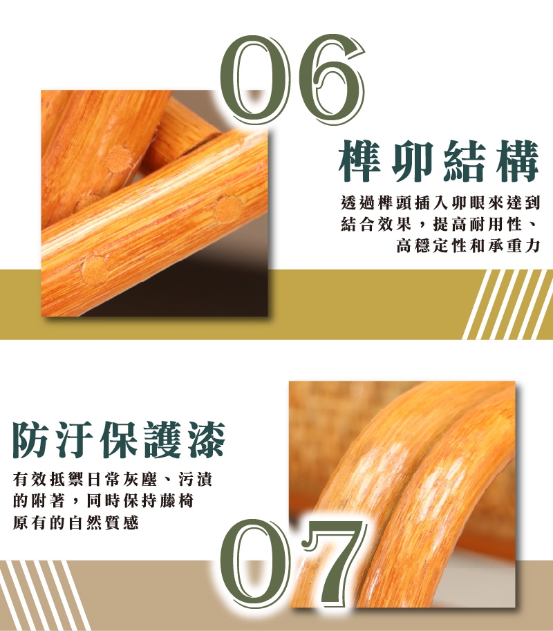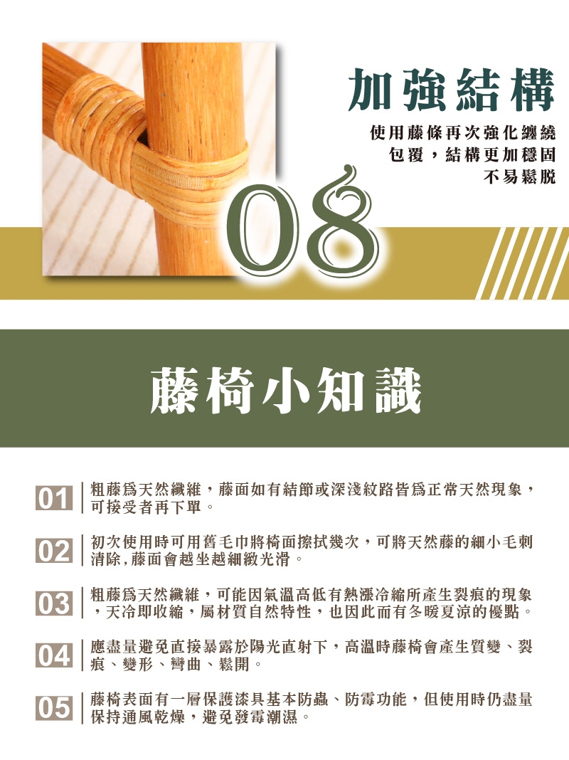 5. 藤椅表面有一層保護漆具基本防蟲、防霉功能,但使用時仍盡量保持通風乾燥,避免發霉潮濕。