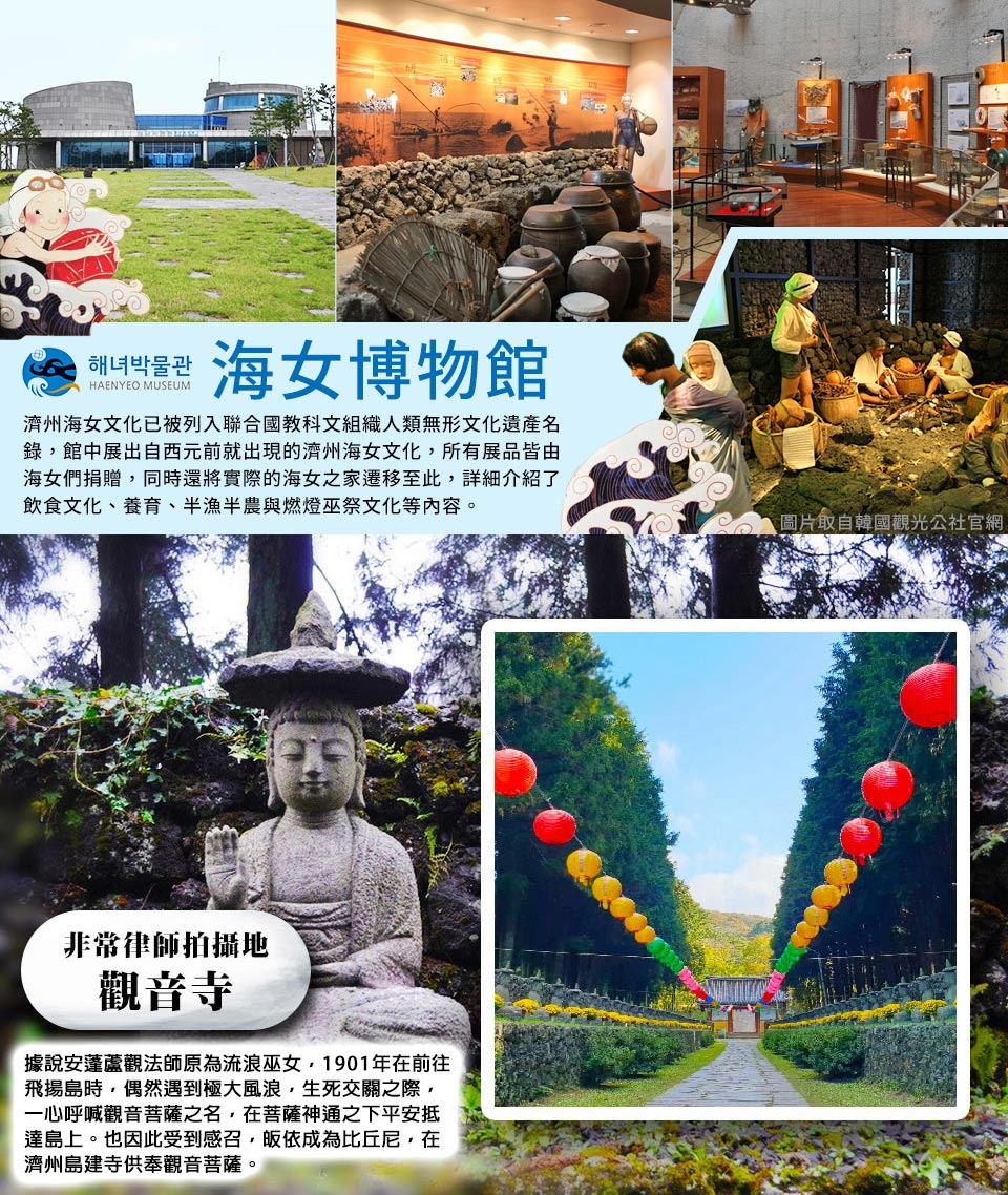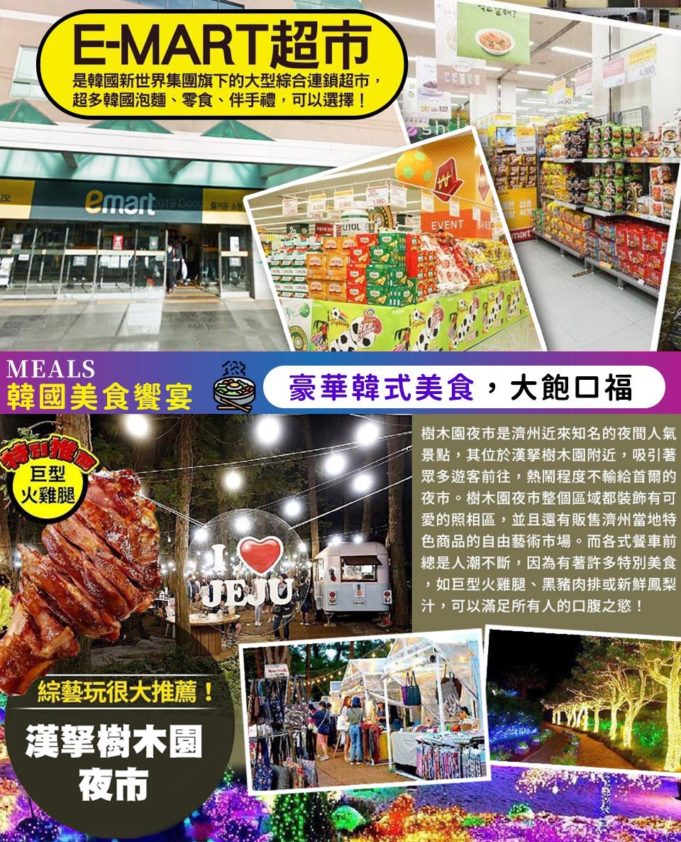 集合於國際機場,搭乘豪華客機飛往韓國渡假聖地濟州島。 【龍淵吊橋】龍頭岩旁的美麗吊橋,正值櫻花季時兩旁可欣賞到美麗的櫻花,天然的兩側岩石及清流的河水造就美麗的風景,吊橋入口處還有可供情侶示愛的愛情仙人掌喔。 【觀音寺】朝鮮王朝以儒教為國教,肅宗時曾任濟州牧使的李衡祥認為當地的雜神信仰過多,查封了500多間祠堂與寺院,使眾多寺院成為廢墟。如今的觀音寺,是1912年在比丘尼安蓬蘆觀法師的主持下重建的,當時名為法井庵。據說安蓬蘆觀法師原為流浪巫女,1901年在前往飛揚島時,偶然遇到極大風浪,生死交關之際,一心呼喊觀音菩薩之名,在菩薩神通之下平安抵達島上。也因此受到感召,皈依成為比丘尼,在濟州島建寺供奉觀音菩薩。然而由於居民的反對,只好避至漢拏山,1912年在靈峰法師與道月居士的幫助下創建法井庵,之後因信徒增加,改名為「觀音寺」。 【IG熱門打卡景點~道頭峰彩虹海岸道路散策】選定為隱藏在濟州的31處秘景之一,自古以來被作為烽火臺使用,因此稱為道頭峰。這裡同時也是彩虹海岸道路散策的開始之處,沿著道路蜿蜒的七彩矮墩,成為了IG打卡的熱門景點。快和三五好友一起,發揮你的創意,留下專屬的獨特回憶照吧! 【漢孥樹木園夜市】這裡的攤位多以可愛的餐車形式呈現,並錯落於茂密的松樹林中,營造出一種如同參加森林派對的放鬆氛圍。除了食物,現場還有許多販售手作飾品、濟州特色文具與蠟燭的攤位,也有傳統的射箭、射擊等小遊戲,非常適合親子或情侶互動。 註:夜市若遇天候因素或臨時休息日,則改由中央地下街替代,敬請見諒。