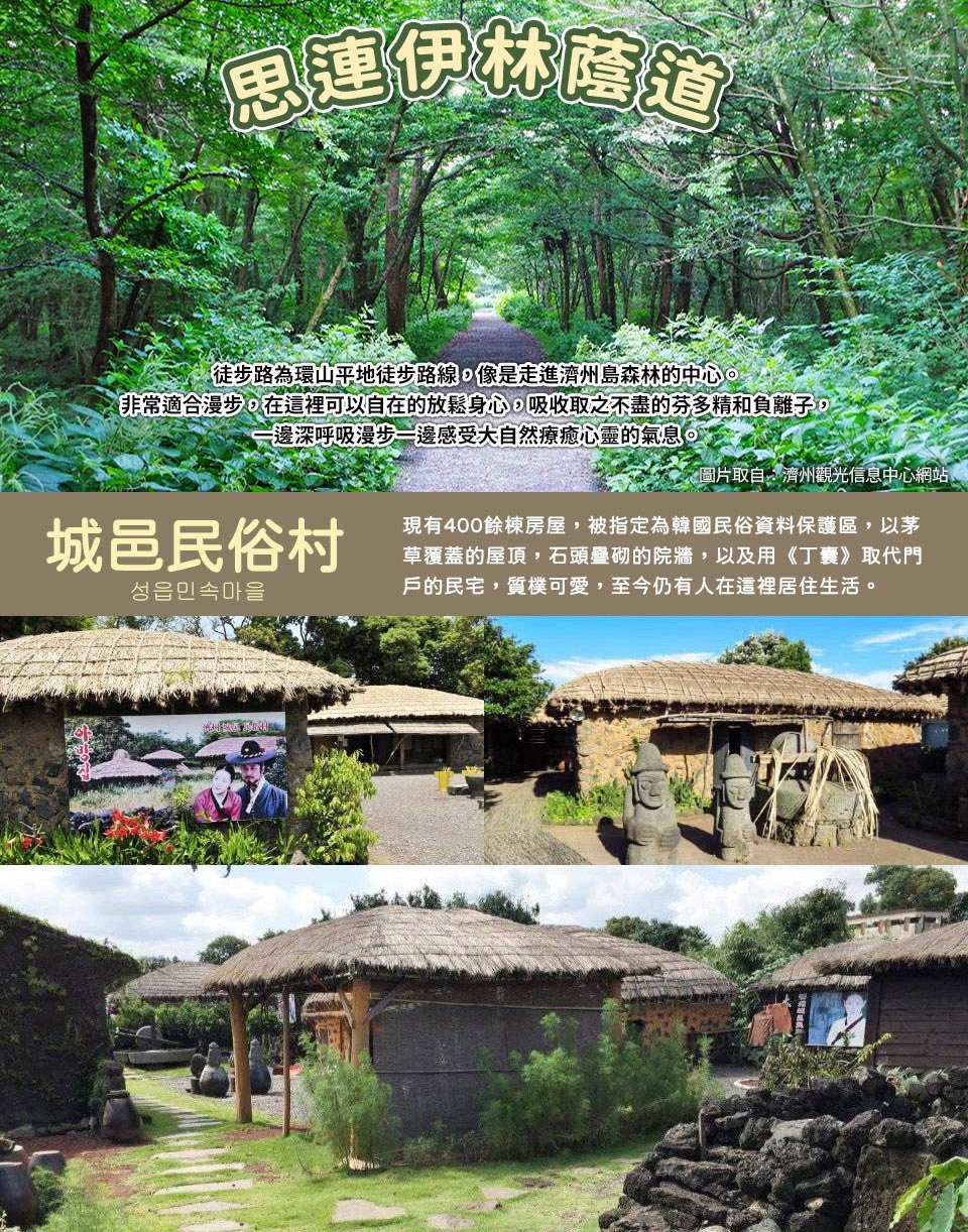 【思連伊林蔭道】徒步路為環山平地徒步路線,像是走進濟州島森林的中心。非常適合漫步,在這裡可以自在的放鬆身心,吸收取之不盡的芬多精和負離子,一邊深呼吸漫步一邊感受大自然療癒心靈的氣息。 【牧官衙觀德亭】位於濟州市三徒2洞的史蹟第380號之濟州牧官衙,為朝鮮時代濟州道的政治、行政中心。官衙內包含主要設施東軒、內衙建築物等。觀德亭也指定為寶物第322號,是重要的遺蹟。濟州現存的建築中,就屬觀德亭歷史久遠。 【東邊松堂童話村+濟州最大星巴克】園內擁有四季繽紛的自然美景,還有島上最大的星巴克和觀景台,公園共有10個個小公園。漢拿山夢岳瀑布園、裝飾成星巴克會議廣場,藍天使歐洲花園世界繡球園、濕地公園茶花路、玻璃花園、湖濱花園、柱狀節理特樹花園、眾神花園。 【吉卜力周邊店Dotorisup橡子共和國】進駐到濟州島松堂童話村內,在這裡可以看到經典卡通【龍貓】【霍爾的移動城堡】的著名場景!更有濟州限定的周邊商品,喜歡的朋友趕緊來打卡吧!(松堂童話村內敬請自行前往) 【七星路商圈】濟州島最具代表性的商圈「七星路」匯集了各大知名服飾品牌門市,形成了一座購物商城,諸多店家中,以在濟州旅遊進行戶外活動時不可或缺的運動服飾門市的數量最多。 專車前往機場,由專人代表辦理出境手續後,搭乘豪華班機返回溫暖的家。 早餐:飯店內用 午餐:海鮮豆腐鍋+營養鍋飯+季節小菜 晚餐:方便逛街 敬請自理 |