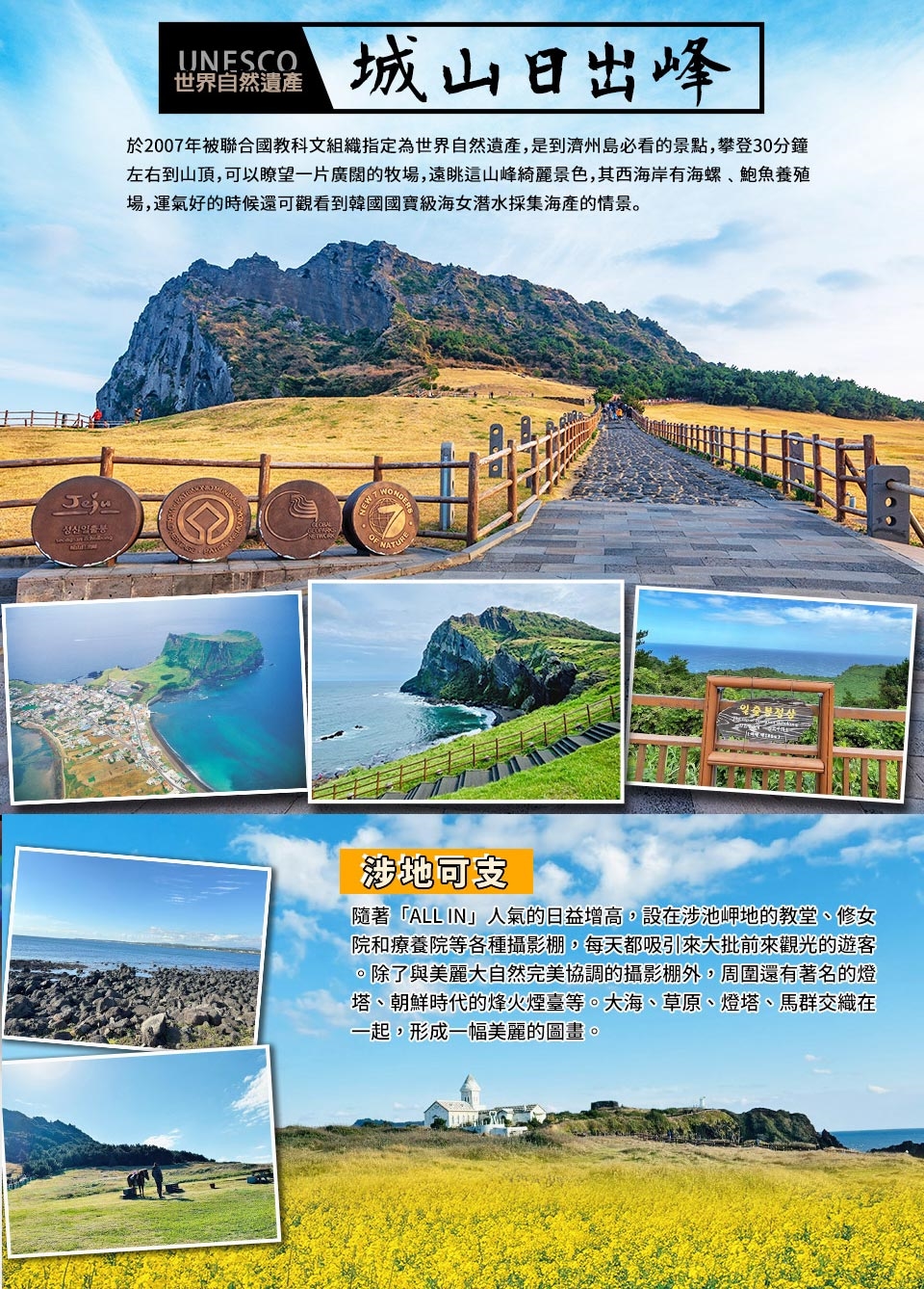 【第2天】 濟州阿里郎『魂』跆拳武藝秀-騎駱駝體驗-世界文化遺產~海女博物館《苦盡柑來遇見你》拍攝地-世界自然遺產~城山日出峰-涉地可支+橙色巨大鞦韆(賞油菜花)-蓮洞商圈 |